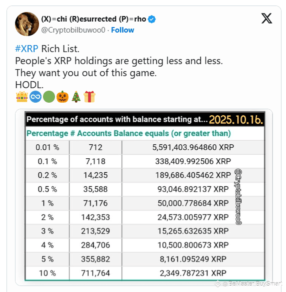 Un aggiornamento recente dall'analista crypto Cryptobilbuwoo0 fornisce un quadro chiaro della distribuzione attuale di XRP, mostrando esattamente quanto XRP è necessario per classificarsi tra il 10% migliore dei detentori. I dati provengono dal XRP Ledger al 16 ottobre 2025 e evidenziano quanto sia concentrata $XRP la proprietà è diventata.