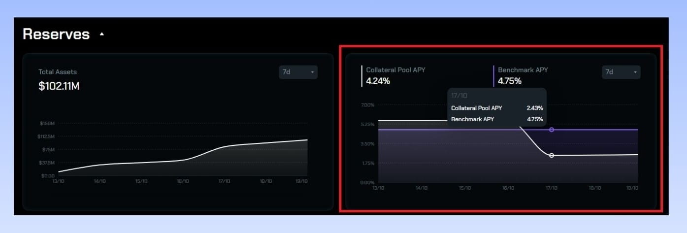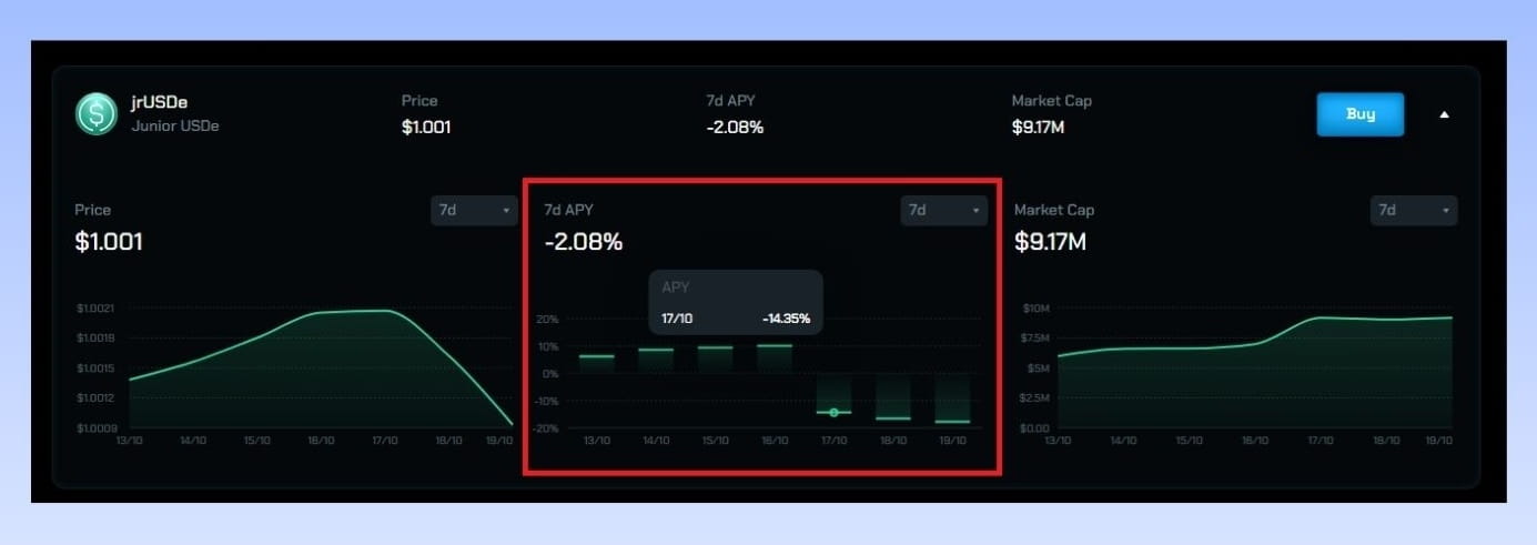 Le differenze nelle variazioni dell'offerta di entrambi, combinate con le variazioni dell'APY di sUSDe, hanno fatto sì che il rendimento dei collaterali cadesse immediatamente sotto il Benchmark APY del 4,75%; a causa del design del tasso di protezione di SSR, il tasso di jrUSDe è diventato negativo.