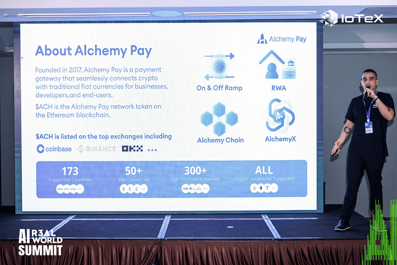 Allo stesso tempo, Alchemy Pay ha anche partecipato al R3al World AI Summit a TOKEN2049, ospitato da IoTeX, dove il team ha interagito con i principali innovatori di Web3 e AI. Arda, il Responsabile Ecosistema di Alchemy Pay, ha tenuto un keynote perspicace evidenziando la missione e la visione di Alchemy Pay, il suo viaggio di espansione globale e i traguardi raggiunti, dalla licenza normativa e crescita dell'ecosistema alle prossime innovazioni che collegheranno ulteriormente la finanza tradizionale e Web3.