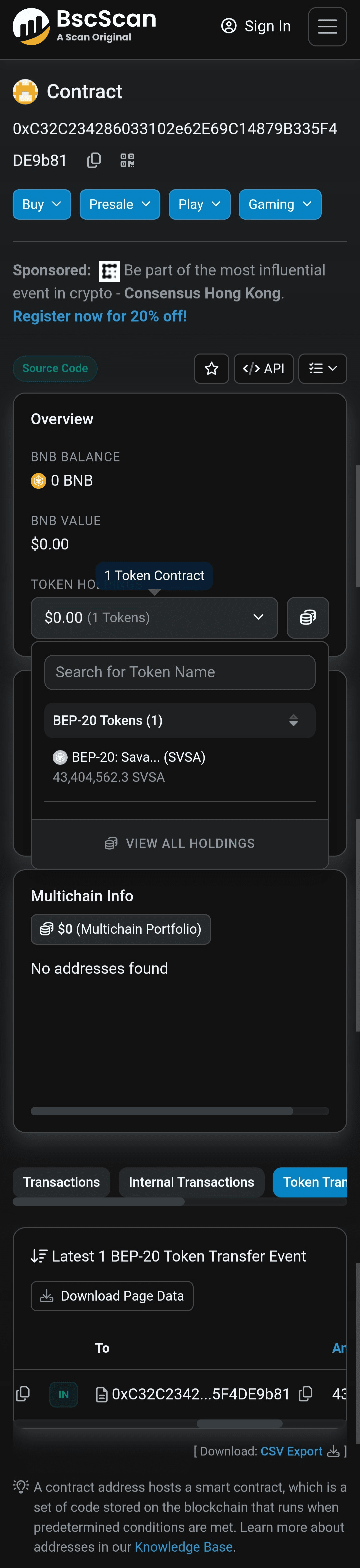 Senza ulteriori indugi, ecco due immagini, che mostrano uno screenshot dell'indirizzo del contratto dei dati on-chain di questo token SVSA