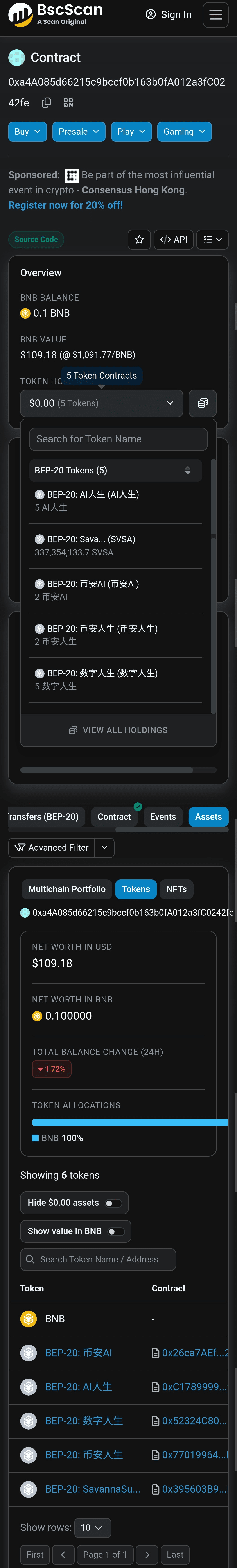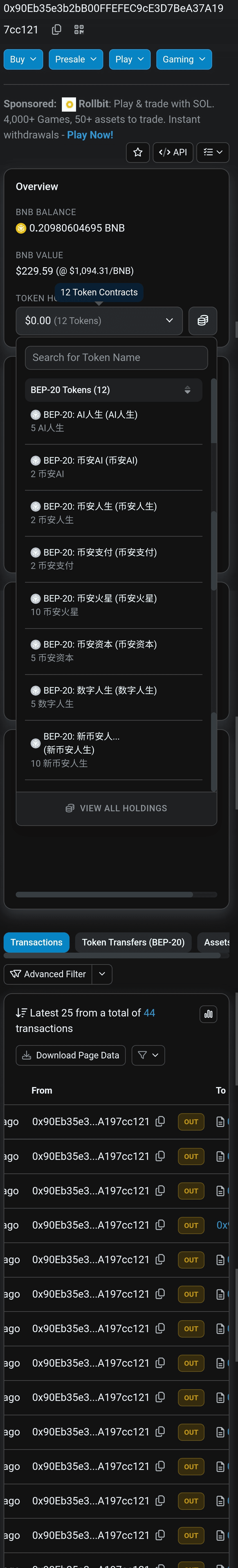 E l'indirizzo dell'emittente possiede i token come mostrato nella figura due, tutti sono token alfar di Binance, come Binance Life, Binance Capital, Binance Mars, ecc., e dalla cronologia delle transazioni di questo account possiamo vedere che l'indirizzo continua a trasferire verso un altro indirizzo