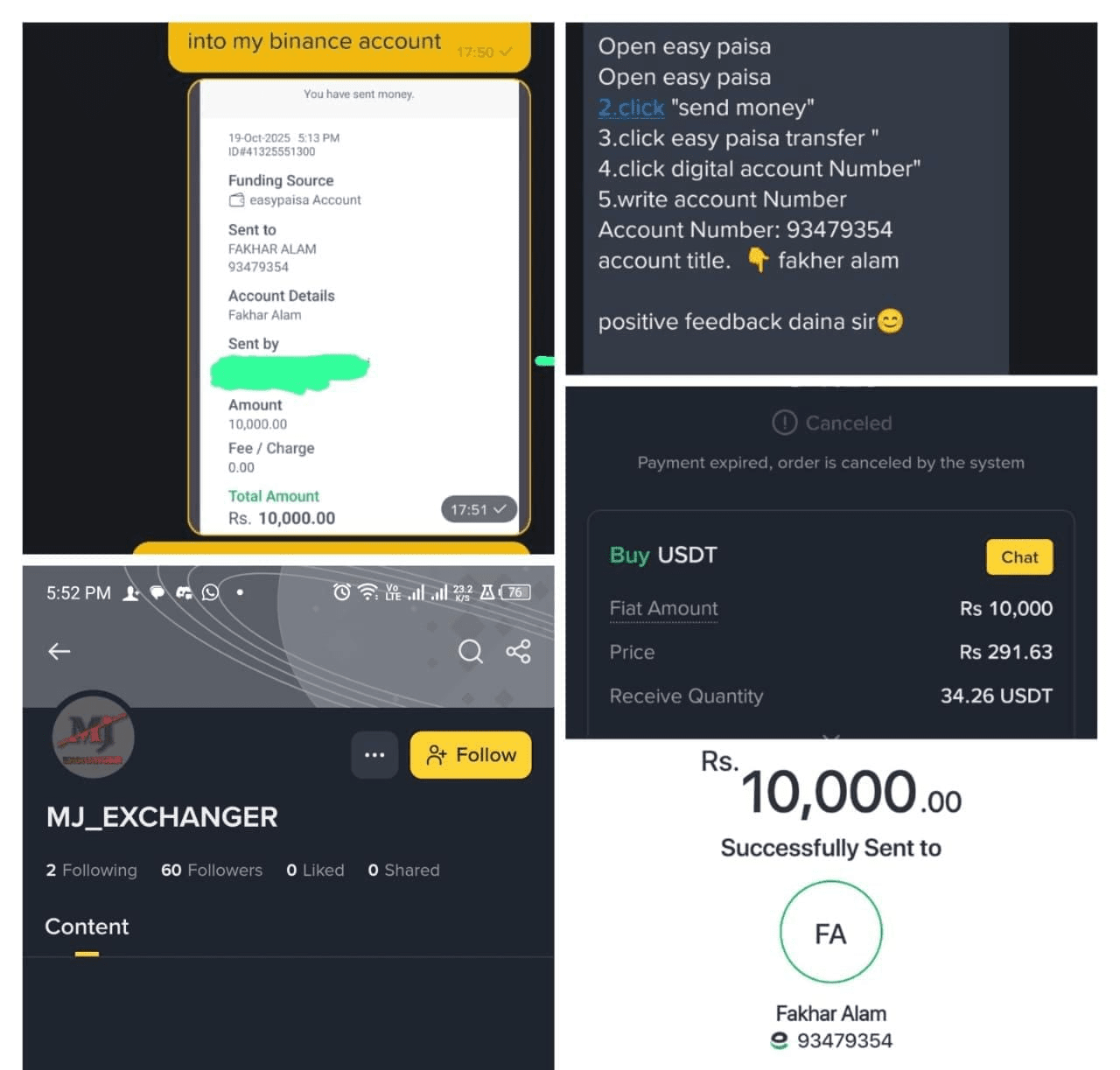 È stato emesso un avviso grave per gli utenti di Binance in Pakistan, dove un truffatore noto come “MJ_Exchanger” si presenta come un legittimo scambiatore di criptovalute. Questa persona inganna gli utenti per ricevere denaro da loro, ma in cambio non viene trasferito alcun importo sui conti Binance. Secondo un utente colpito, ha inviato denaro a questo truffatore tramite EasyPaisa, i cui dettagli sono riportati di seguito.