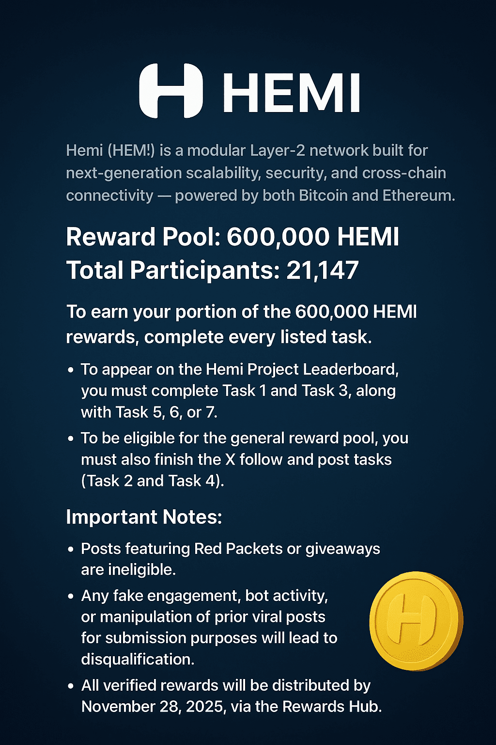 Per guadagnare la tua parte delle ricompense di 600.000 HEMI, completa ogni compito elencato. I primi 100 creatori nella classifica del Progetto Hemi di 30 Giorni riceveranno il 70% del fondo totale di ricompense, mentre i rimanenti partecipanti qualificati divideranno il 20% di esso. Inoltre, i primi 50 creatori nella classifica degli Creatori Square (classifiche di 7 giorni) dalla data di lancio della campagna condivideranno il 10% finale.