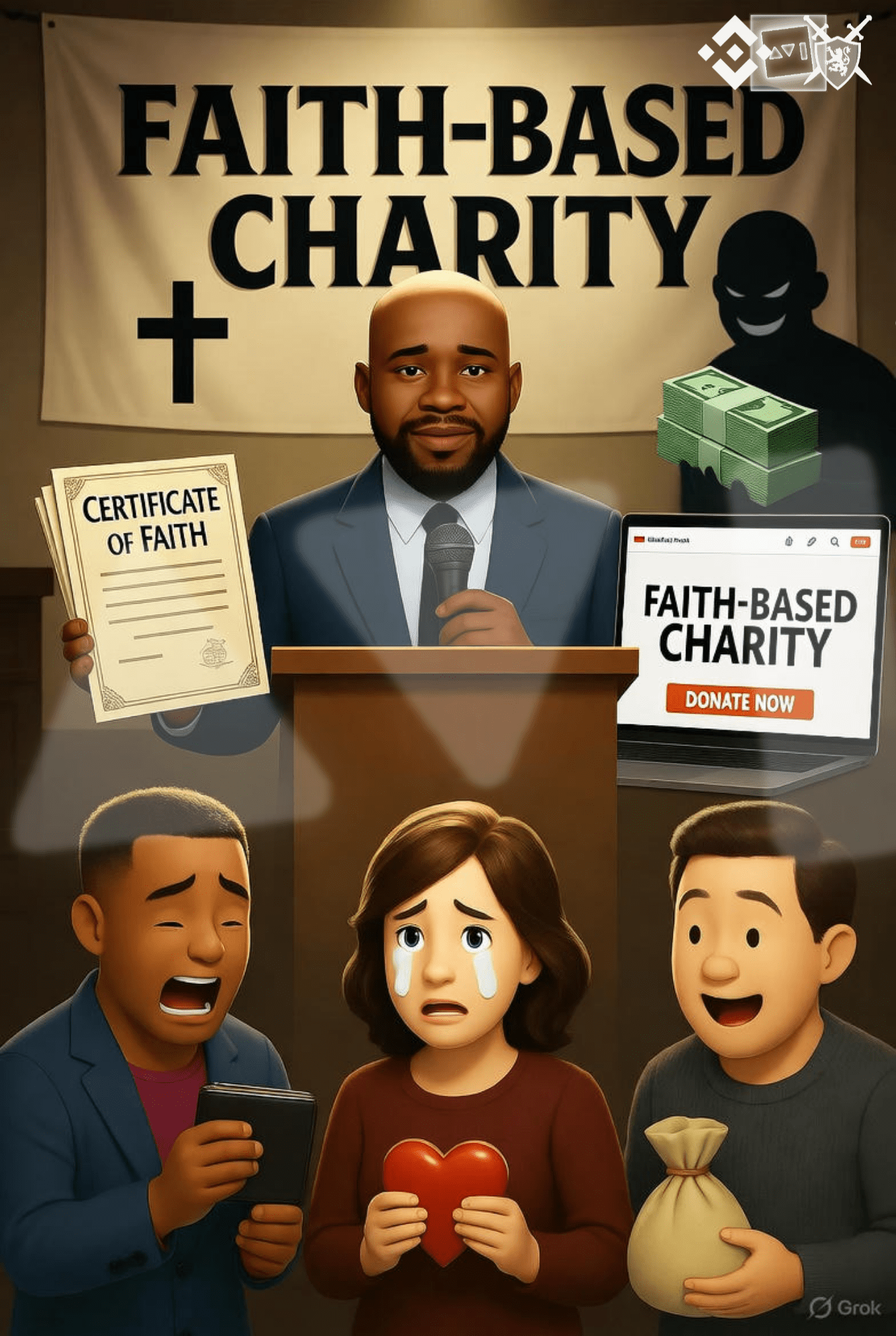 Costruendo sulla truffa per il soccorso alle inondazioni, immagina un racket più organizzato che si evolve in una rete di "charity" fraudolente "basate sulla fede", orchestrato da un sindacato guidato da un carismatico capo organizzatore di nome Victor. Questa operazione imita organizzazioni religiose legittime ma è guidata puramente dall'avidità, simile ai pastori corrotti che sfruttano le congregazioni per guadagni personali sotto le spoglie di diffondere il Vangelo. Victor, un ex marketer con contatti in anelli di falsificazione sotterranei, assemble un team di complici che adottano molteplici identità false, supportate da certificazioni contraffatte per dare un'aria di credibilità. Il racket prende di mira le comunità vulnerabili—come quelle in recupero da disastri, quartieri a basso reddito o gruppi di fede online—promettendo salvezza spirituale e materiale mentre siphonano donazioni nei forzieri personali.