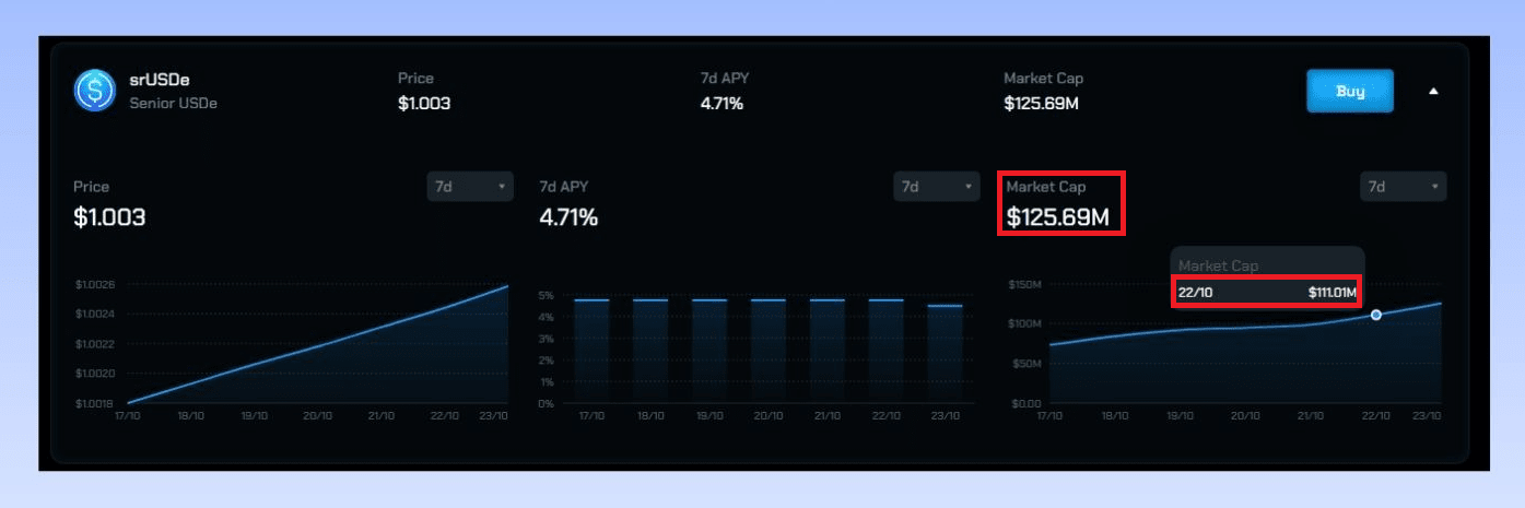 Ora è probabilmente un concetto di corsa contro il tempo, poiché il flusso netto di srUSDe con tasso di rendimento garantito è significativamente superiore a quello di jrUSDe, che deve coprire i rendimenti di srUSDe, l'offerta di srUSDe è aumentata di 14 milioni in un giorno, mentre jrUSDe non è ancora cresciuto.