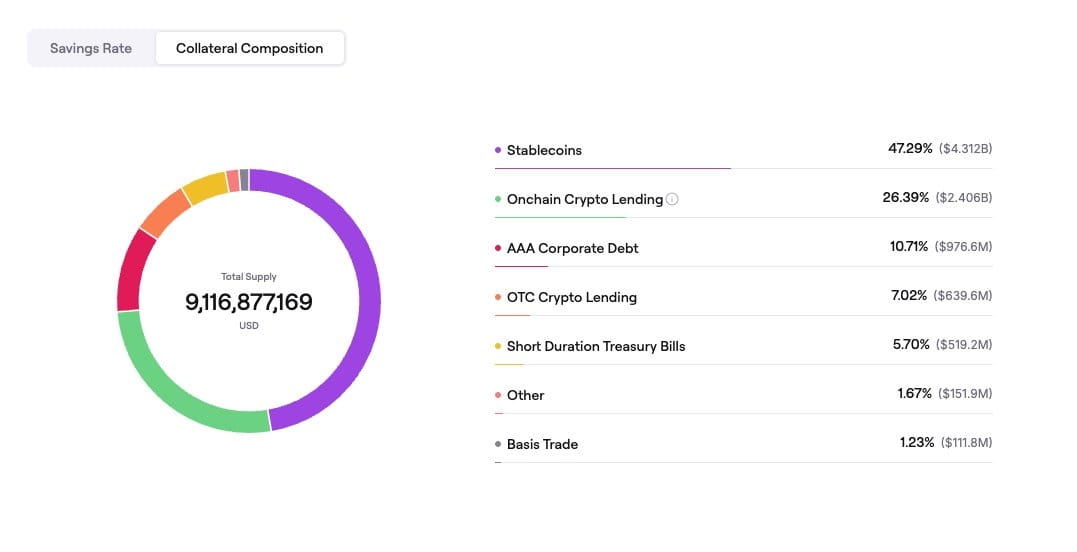 La fonte di dati di tracciamento originale, Sky Protocol (ex MakerDAO) SSR, ha fonti di guadagno che coprono vari asset on-chain + off-chain, tra cui stablecoin, obbligazioni aziendali di classe A, prestiti in criptovaluta, buoni del tesoro a breve termine, ecc., con una crescente dipendenza da asset non on-chain.