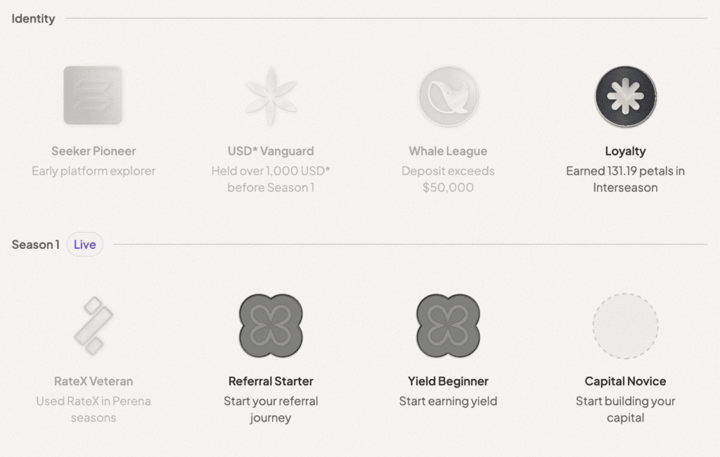 Documento ufficiale della stagione https://perena-docs.gitbook.io/perena/perena-season-1-petals-and-badges-guide