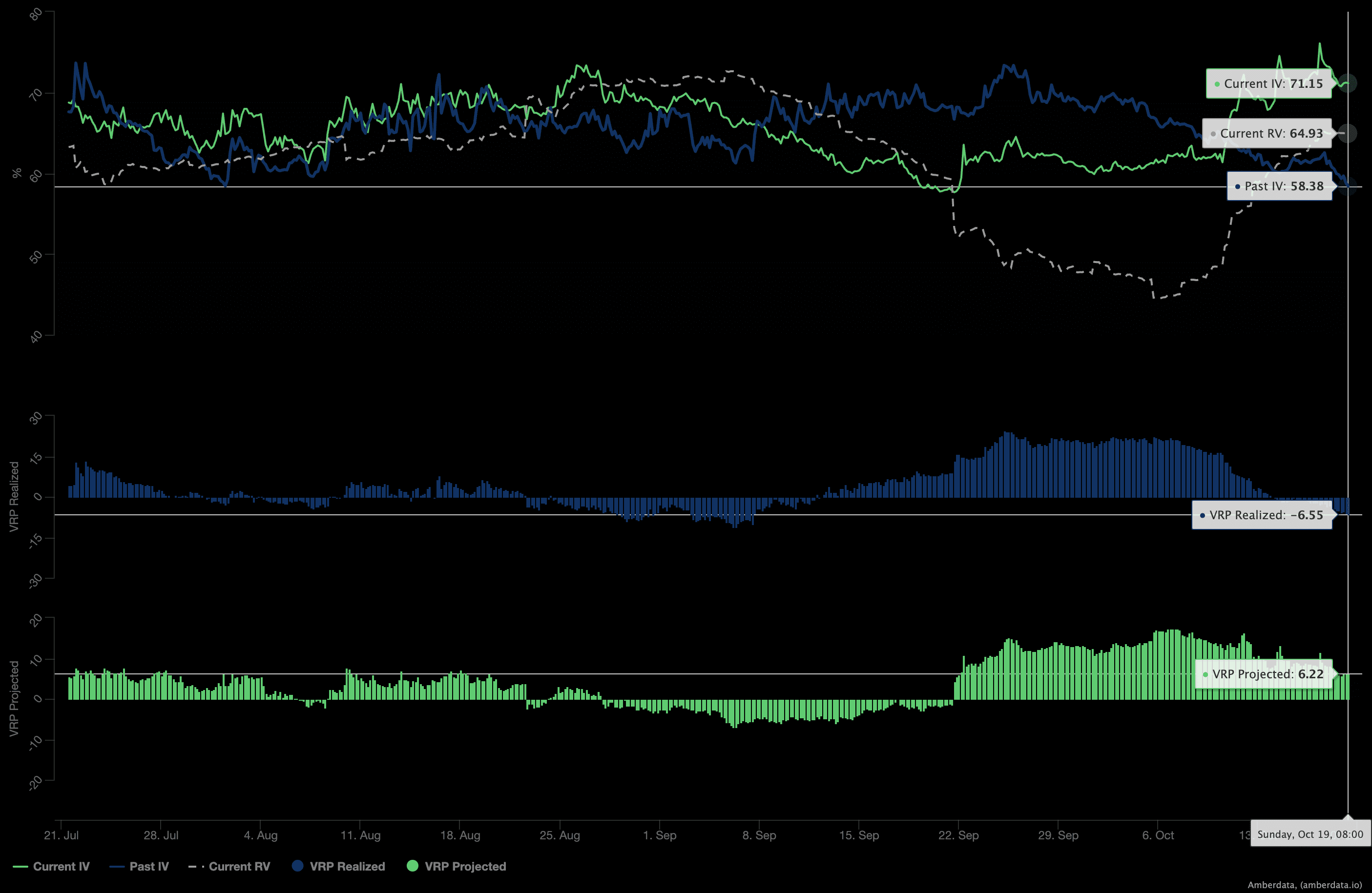 VRP Projected(预期部分)处于高正值(历史高位):表明当前隐含波动率(IV)被市场普遍认为“定价过高”,且预期未来30天内实际波动率(RV)将大幅回落——从表面看,这似乎暗示“做空波动率(Short Volatility)”策略的吸引力正在增强。