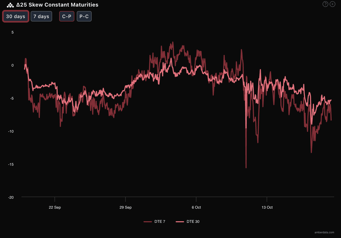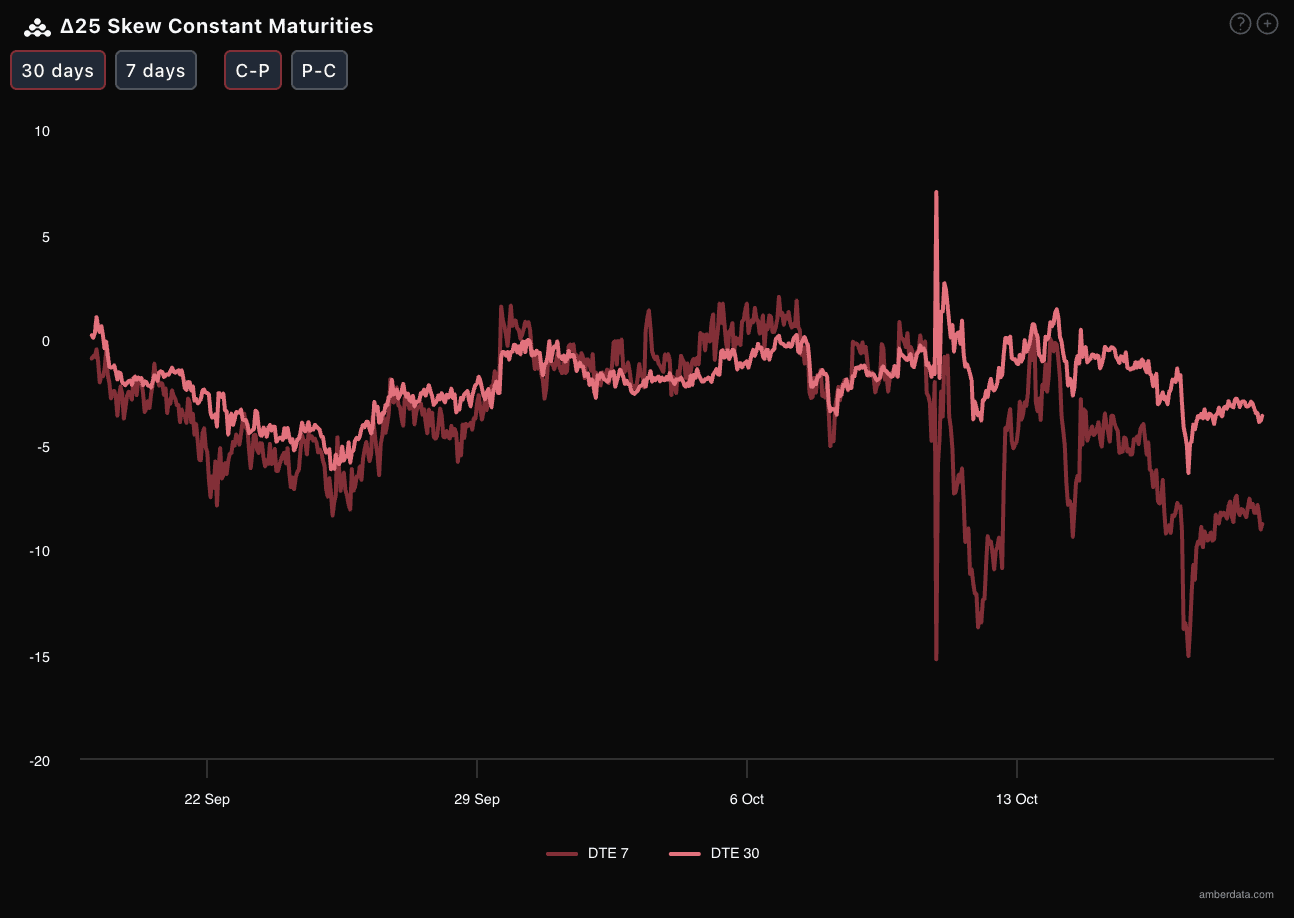 通过Delta 25 Skew(看涨期权隐含波动率IV - 看跌期权IV)观察:近期BTC与ETH的该指标基本处于显著的负值区间,意味着市场对下行(看跌)尾部风险赋予了更高定价,看跌情绪或下行对冲需求极为旺盛。更值得警惕的是:DTE 7天(7天后到期合约)的负Skew值比DTE 30天更剧烈,且ETH的DTE 7天负Skew值远低于BTC——这直接指向两个结论: