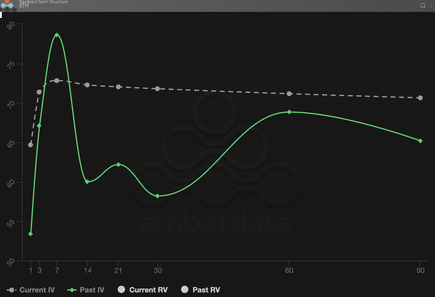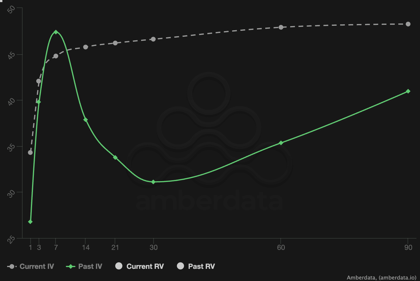 当前IV(隐含波动率)期限结构呈现“近端高企、远端缓升”的特征:DTE 7天附近存在局部高点,随后曲线缓慢上升至DTE 90天的更高水平。而回顾Past IV(历史同期期限结构),曾出现过明显的“驼峰”形态——表明市场曾在某一时期经历短暂但剧烈的短期波动,导致短期IV异常高昂。更关键的是:当前Current IV在远端(DTE 60/90)明显高于Past IV,说明市场对未来3-6个月的波动中枢预期正在系统性抬升。尽管DTE 7天的高点反映短期事件风险的即时定价,但长期IV的持续上升揭示了一个深层信号:投资者认为未来的宏观不确定性将高于历史平均水平,而非单纯的短期情绪扰动。