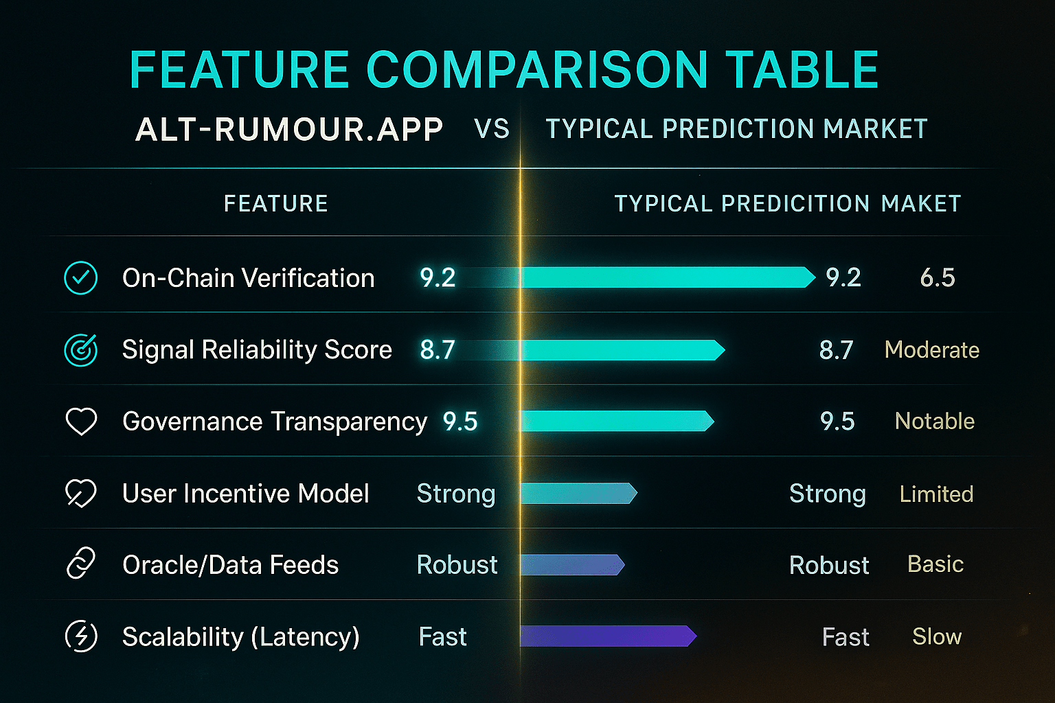 Alt-Rumour.app elimina l'ambiguità delle funzionalità nascoste e dei meccanismi di validazione per gli utenti, che spesso rimangono sulle piattaforme di rumor. Questa piattaforma offre un framework di confronto delle funzionalità trasparente affinché gli utenti possano comprendere in che misura qualità del segnale in tempo reale, verifica e insight pronti per il trading siano disponibili.