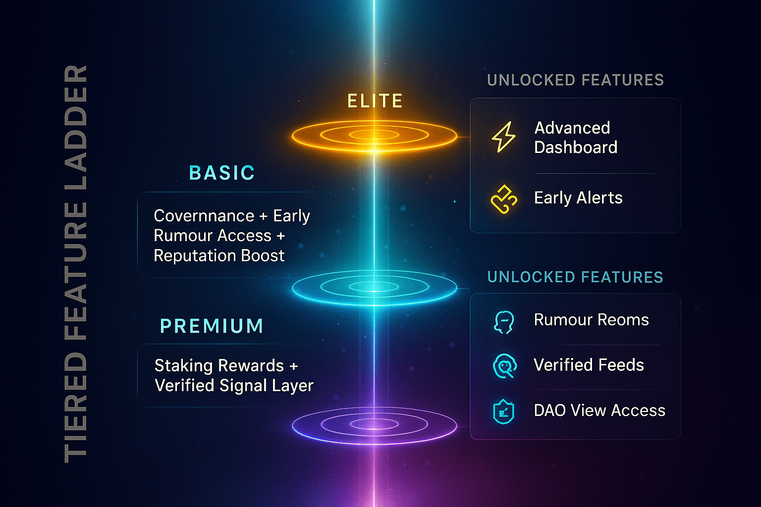 Tier 3 (Elite): Questo è il livello più alto dove agli utenti vengono fornite caratteristiche prestigiose come diritti di voto di governance, ricompense token speciali e 'liste di power-user'. Gli utenti di questo tier non sono solo consumatori di informazioni, ma diventano partner nella definizione delle politiche e nello sviluppo della piattaforma.