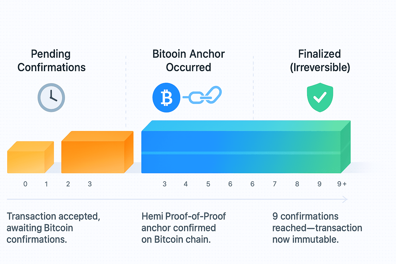 Secondo la politica generalmente menzionata nella documentazione di HEMI, un blocco HEMI può essere considerato finalizzato Bitcoin-ancorato dopo aver ricevuto conferme da circa 9 blocchi Bitcoin (9 blocchi in 90 minuti, secondo il tempo medio di blocco). Questo intervallo di tempo implica che man mano che si ricevono conferme, la possibilità di riorganizzazione in Bitcoin diminuisce, e $HEMI lo stato sarà considerato irrevocabile.