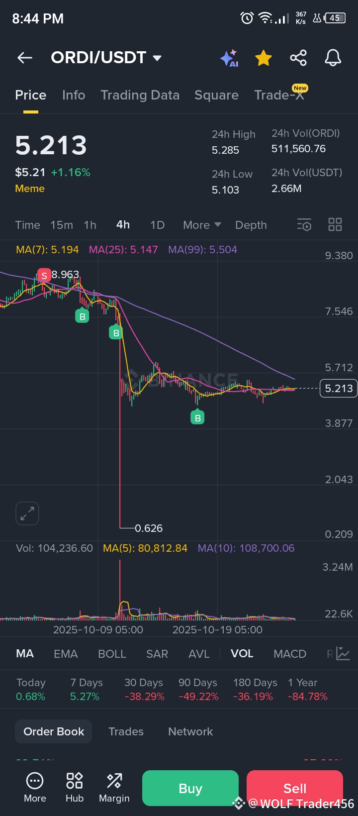 The cryptocurrency market is known for its volatility, and ORDI/USDT, a popular trading pair on Binance Square, is no exception. As of October 25, 2025, at 8:44 PM PKT, the latest chart data provides valuable insights into potential entry and exit points for traders. This article analyzes the current price trends, technical indicators, and market sentiment to guide your next move in trading ORDI/USDT.Current Market OverviewThe ORDI/USDT pair is currently trading at $5.213, reflecting a modest 1.16% increase in the last 24 hours. However, the chart reveals a significant drop from a recent high of $8.963, indicating a bearish trend over the short term. The 24-hour trading volume stands at $511,560.76 for ORDI and $2.66M in USDT, suggesting moderate market activity. Key moving averages (MA) include MA(7) at $5.194, MA(25) at $5.147, and MA(99) at $5.504, with the price hovering near these levels.Technical AnalysisMoving Averages (MA): The price is closely aligned with the 7-day and 25-day MAs, suggesting a potential consolidation phase. However, the downward trajectory from the $8.963 peak indicates bearish momentum unless a strong reversal occurs.