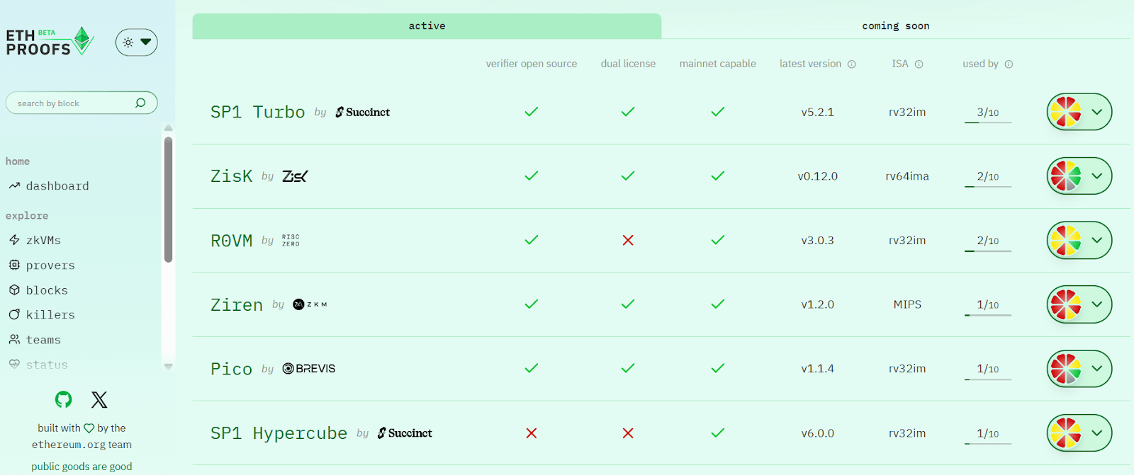 Attualmente, ETHProofs.org supportato dalla Ethereum Foundation è diventato la piattaforma principale di tracciamento della rotta di prova in tempo reale (Realtime Proving, RTP) L1, per mostrare pubblicamente le prestazioni, la sicurezza e i progressi di adattamento alla mainnet di ciascun zkVM.