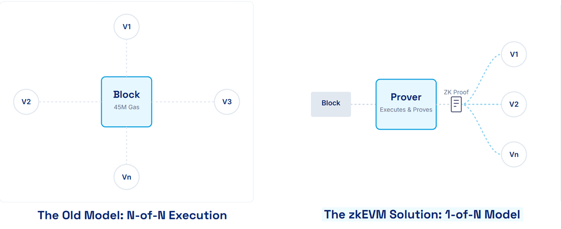 1 di N nuova modalità: un numero ridotto di prover esegue l'intero blocco e genera prove brevi; l'intera rete verifica solo in tempo costante. I costi di verifica sono molto inferiori rispetto alla riesecuzione, consentendo di aumentare in sicurezza il limite del gas L1 e ridurre i requisiti hardware.