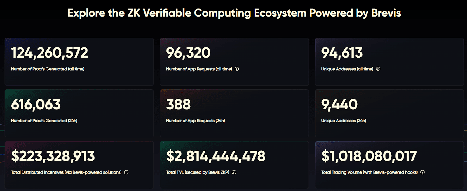 Secondo i dati di Brevis Explorer, entro ottobre 2025, la rete Brevis ha generato oltre 125 milioni di ZK prove, coprendo quasi 95,000 indirizzi e 96,000 richieste di applicazione, servendo ampiamente scenari come distribuzione di ricompense, verifica di transazioni e prove di staking. A livello ecosistemico, la piattaforma ha distribuito circa 223 milioni di dollari in incentivi, sostenendo un TVL superiore ai 2.8 miliardi di dollari, con volumi di transazione cumulativi che superano i 10 miliardi di dollari.