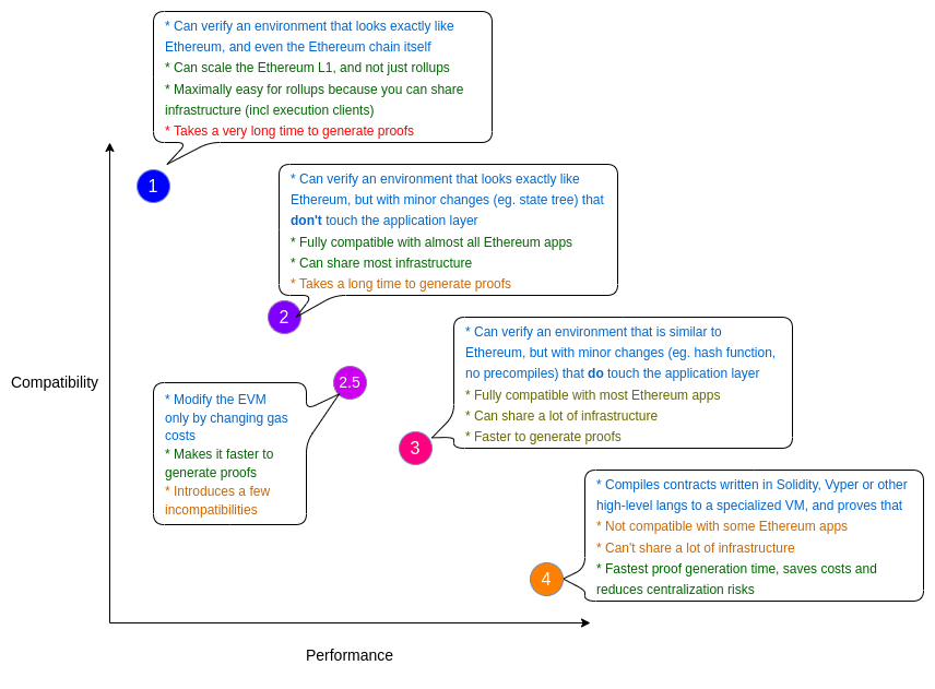Tipo 4 linguaggio: abbandono della compatibilità del bytecode, compilazione diretta da linguaggi di alto livello a circuiti, prestazioni ottimali ma necessità di ricostruire l'ecosistema (rappresentanti: Starknet / Cairo).