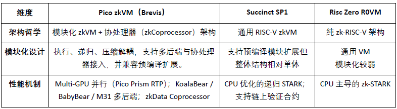 Rispetto all'architettura RISC-V relativamente monolitica di Succinct SP1 e al modello di esecuzione RISC-V generico di RISC Zero R0VM, Pico realizza decoupling ed estensione delle fasi di esecuzione, ricorsione e compressione tramite Modular zkVM + Coprocessor System, supportando il passaggio a più backend e integrazione di coprocessori, formano un vantaggio competitivo in termini di prestazioni e scalabilità.