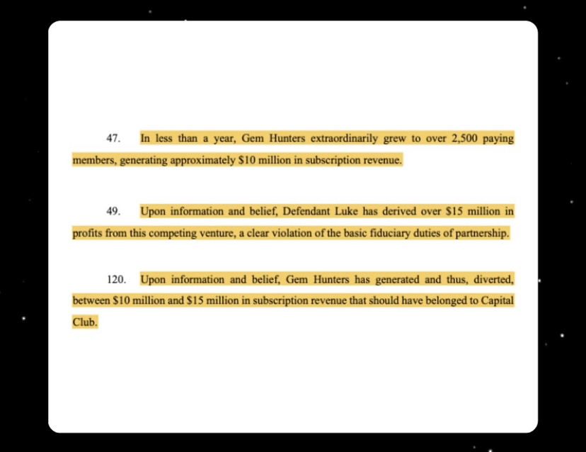 Mentre erano ancora partner, Luke ha segretamente lanciato Gem Hunters - un'impresa concorrente costruita con il team, l'infrastruttura e i dati dei clienti del Capital Club.