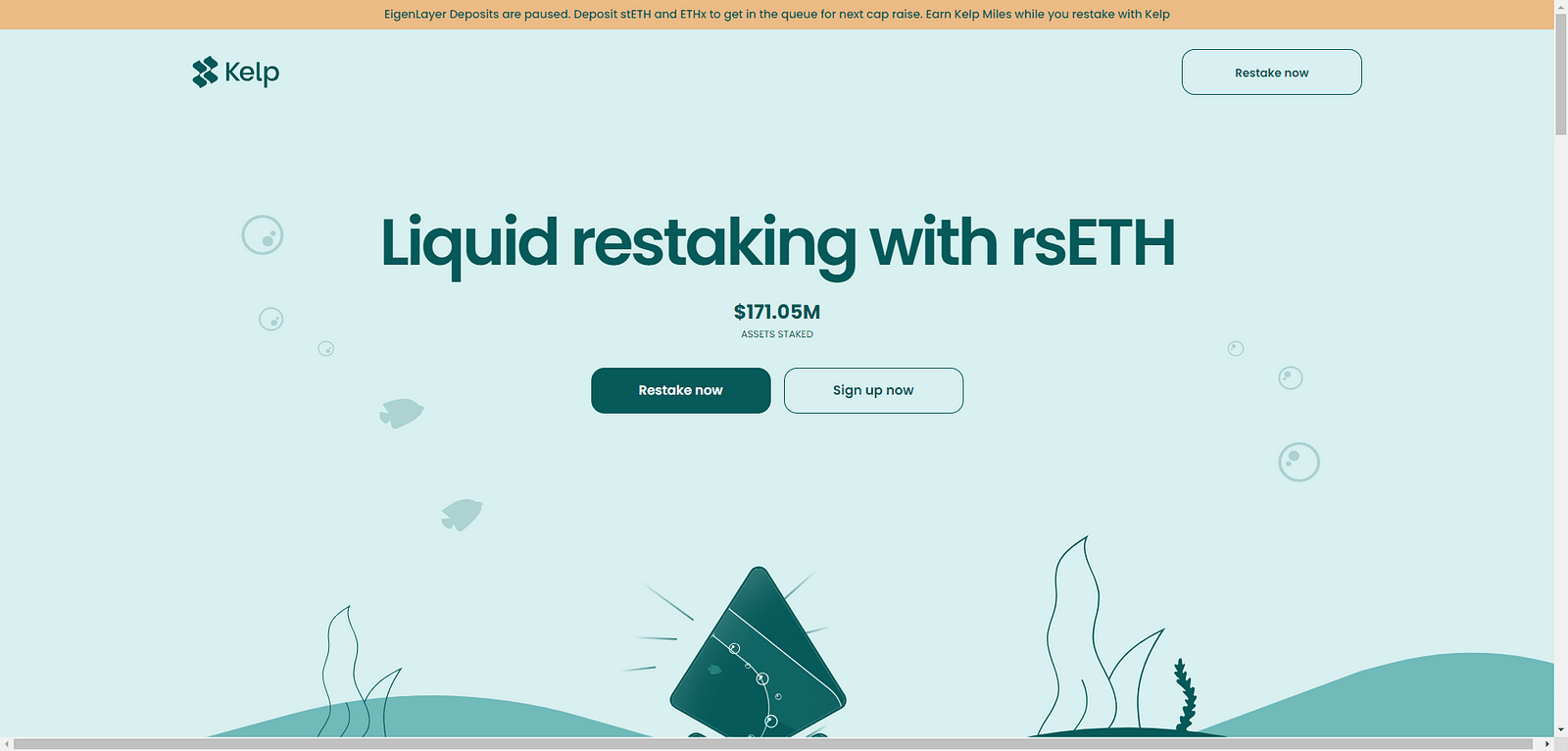 Kelp DAO è un progetto Restaking realizzato da Stader Lab, un progetto LSD che supporta il multi-chain. Appartiene al tipo Restaking Liquid-LSD menzionato sopra. Tuttavia, è attualmente aperto al deposito di stETH di Lido e ETHx di Stader. a causa dell'attuale quota LST di EigenLayer è piena, quindi i depositi sono attualmente sospesi.