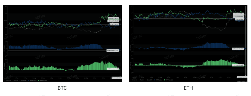 VRP Proiettato (VRP atteso) è positivo: nonostante il VRP realizzato sia negativo, l'attuale VRP atteso è positivo (BTC +1.14, ETH +0.51). Questo implica statisticamente che l'attuale volatilità implicita IV è generalmente considerata sovrastimata dal mercato.