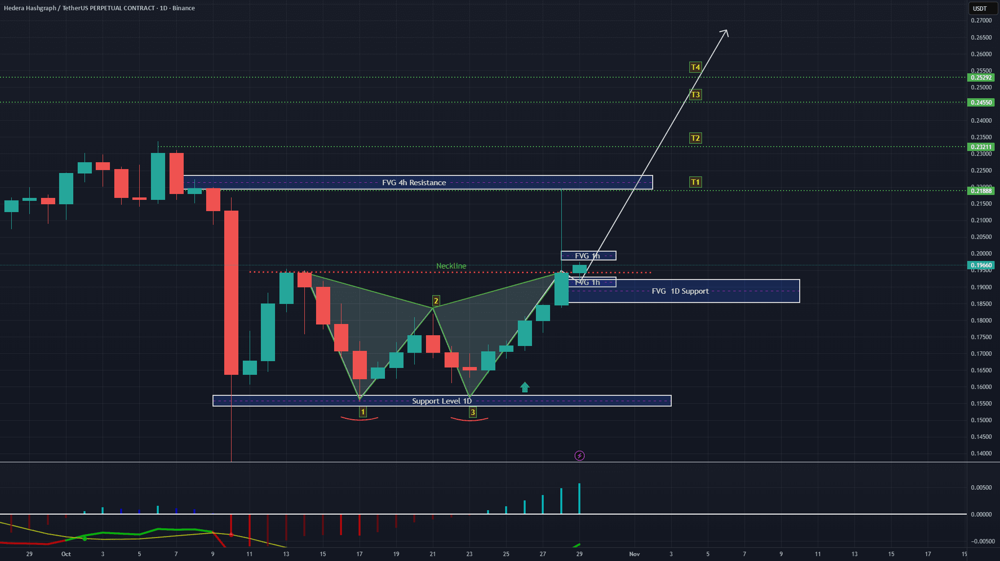 Su entrambi i grafici 1H e 1D, HBAR ha confermato un modello di doppio fondo intorno al livello di supporto 0.155–0.16, seguito da una forte rottura sopra la linea del collo.