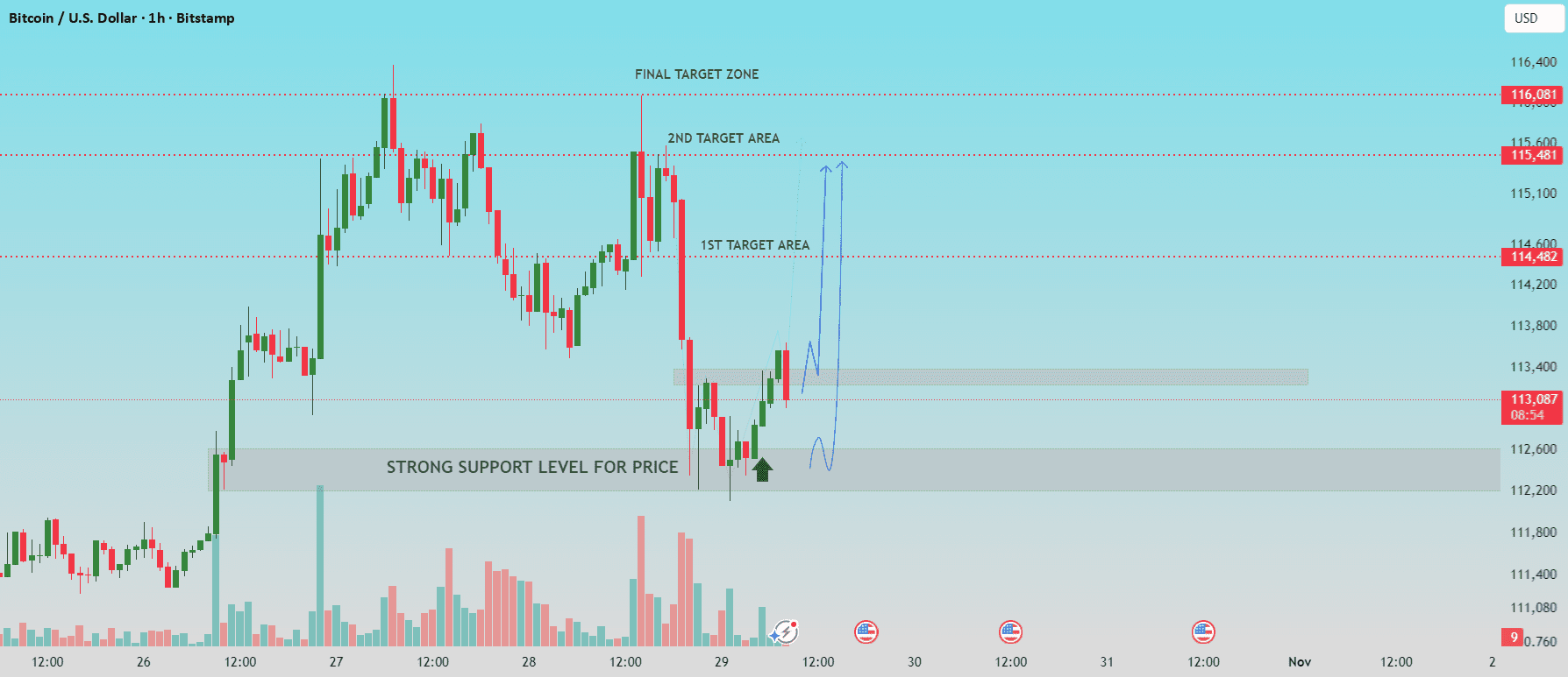 Il prezzo sta attualmente scambiando vicino a $113,437, costruendo slancio sopra il supporto. Una rottura sostenuta e una chiusura sopra $114,000 potrebbero confermare la continuazione del trend rialzista verso le prime e seconde aree target.