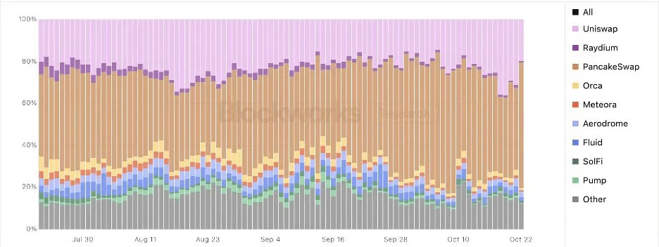 一个很有前景的例子是,在 2025 年年中,币安推出了 Binance Alpha,一个流动性激励和建设者计划,引发了链上 DEX 活动的急剧增加。BNB Chain 的 DEX 交易量曾短暂超过链上现货总交易量的 70%,展示了生态系统潜在用户和开发者参与的深度。