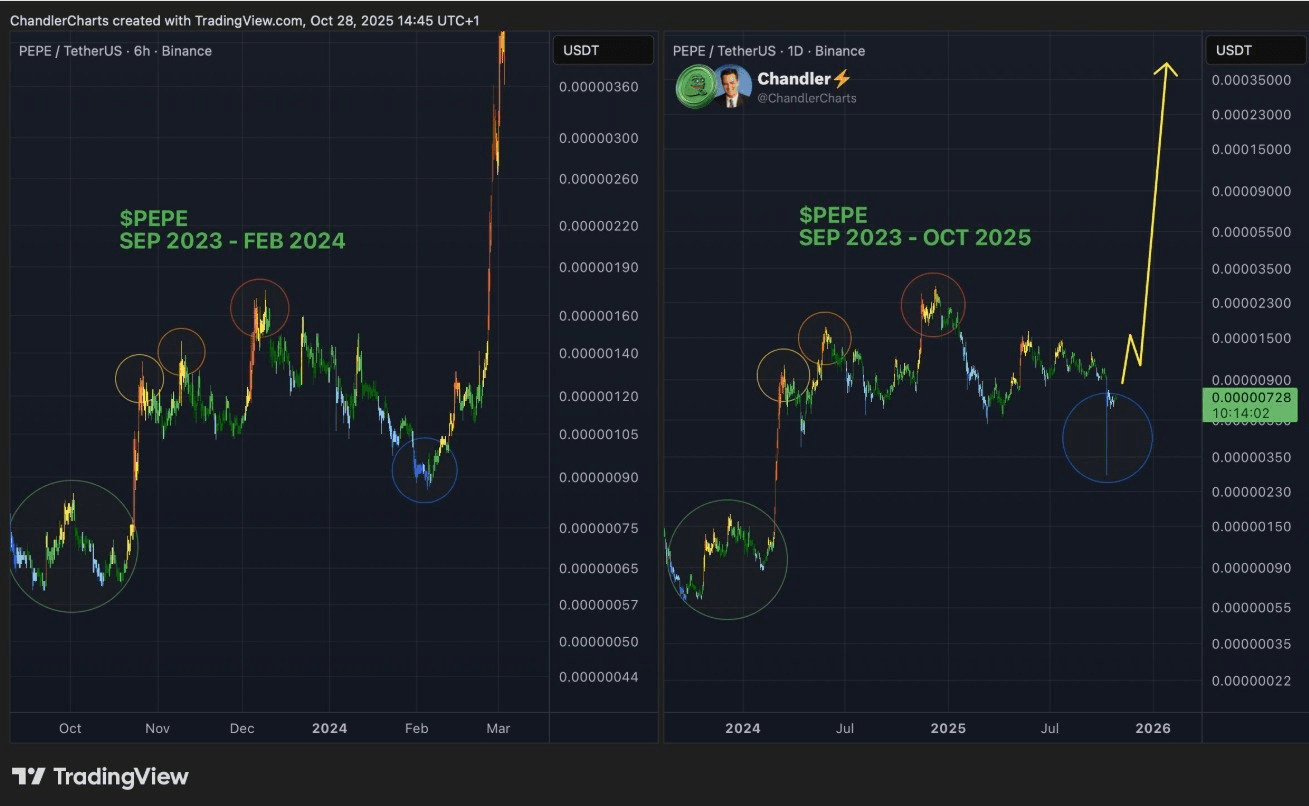 Chandler ha osservato modelli identici di accumulazione, rottura e consolidamento confrontando i periodi da settembre 2023 a febbraio 2024 e ottobre 2025. Nel 2024, queste formazioni hanno preceduto un aumento del 288%, portando il PEPE da US$ 0,0000009 a US$ 0,0000035.