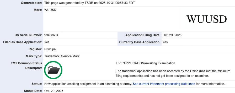 Secondo la richiesta, il marchio WUUSD può essere utilizzato per portafogli di criptovalute, servizi di trading di criptovalute, elaborazione di pagamenti in valute stabili, oltre a altre applicazioni.