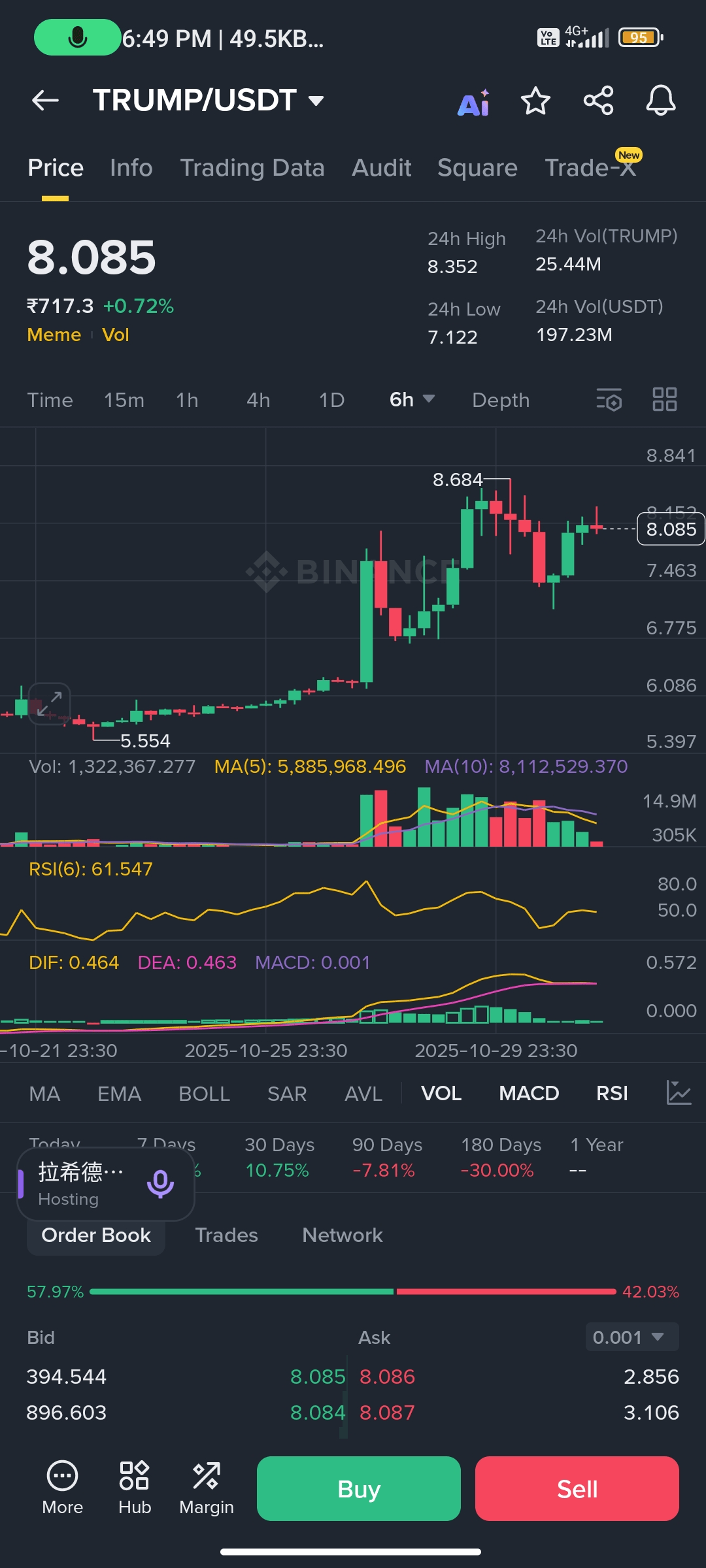 TRUMP si mantiene stabile dopo un enorme raduno, registrando $197M+ in volume di trading di 24 ore e raggiungendo un picco di $8.684 prima di entrare in una fase di consolidamento. La tensione sta aumentando: i tori ricaricheranno per un altro rialzo o una correzione è dietro l'angolo?