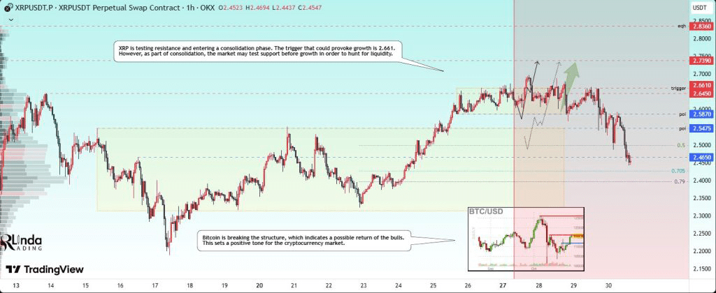 Guardando il grafico orario per la coppia Ripple/Tether (XRP/USDT), la criptovaluta Ripple viene scambiata all'interno di un intervallo definito, con una resistenza significativa nell'area di 2,66$-2,79$.