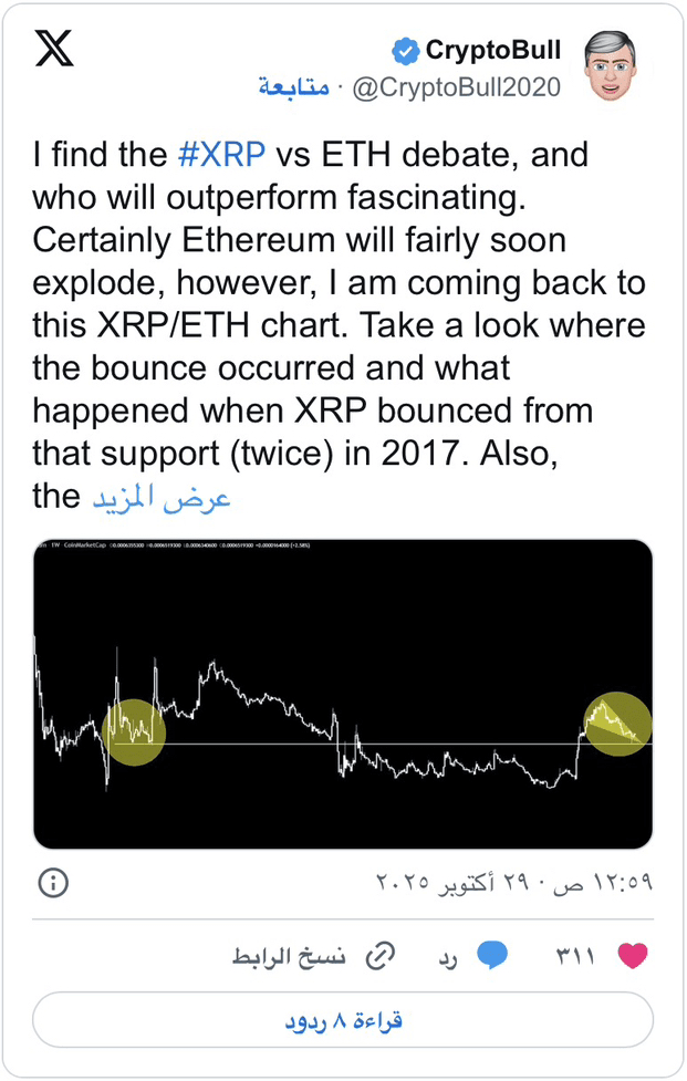 Tuttavia, gli analisti avevano già previsto il vincitore della battaglia accesa con l'avvicinarsi della fine del 2025, poiché l'analista CryptoBull ha osservato che il grafico dei prezzi della criptovaluta Ripple rispetto a Ethereum su un intervallo di tempo settimanale mostra un modello simile al primo grande aumento del suo prezzo nel 2018, quando la criptovaluta Ripple ha raggiunto il suo massimo storico a 3,84$.