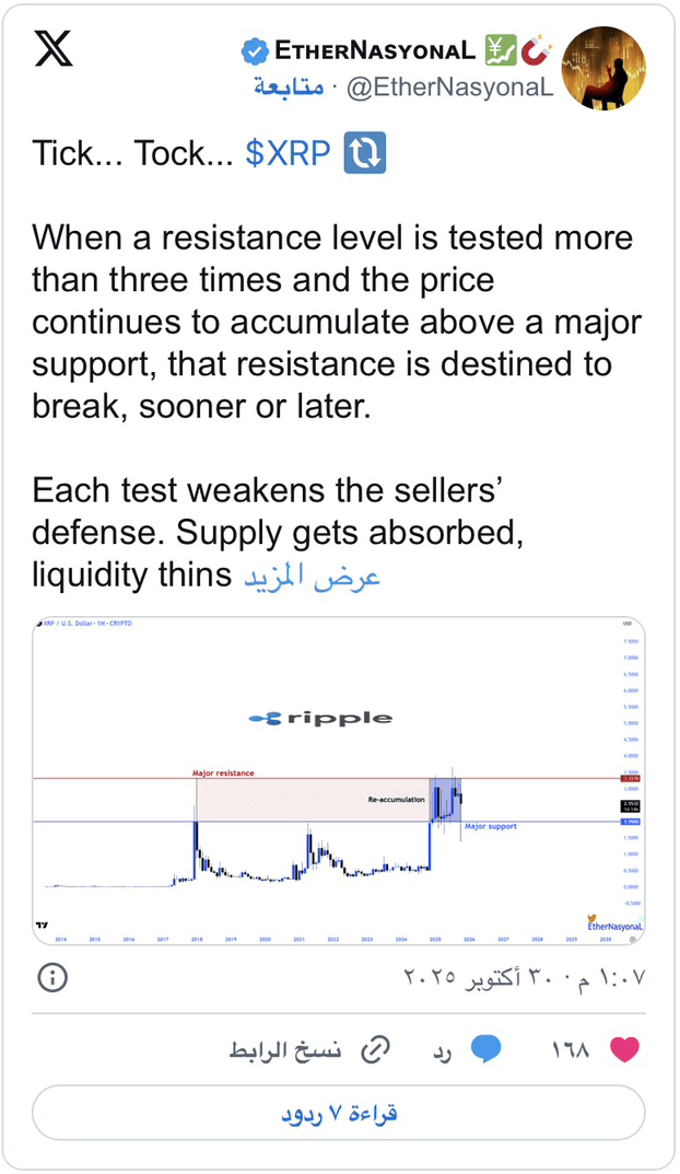 L'analista tecnico EtherNasyonaL ha osservato che quando un livello di resistenza viene testato più di tre volte e il prezzo continua a accumulare slancio sopra il livello di supporto principale, questa resistenza sarà spezzata prima o poi.