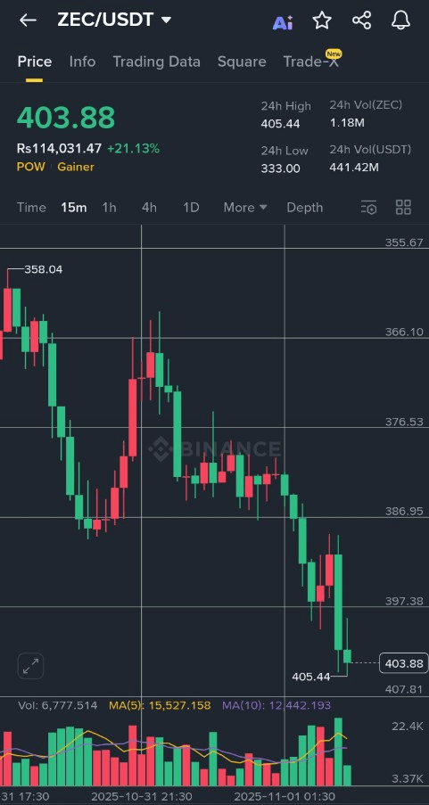 In questo momento, $ZEC sta negoziando attorno a $403–$404, appena al di sotto del massimo intraday di $405.44. Il volume sta aumentando, la volatilità si sta espandendo e l'intera struttura del trend è inclinata al rialzo. Ogni ritracciamento finora viene assorbito immediatamente, mostrando una chiara dominanza degli acquirenti.