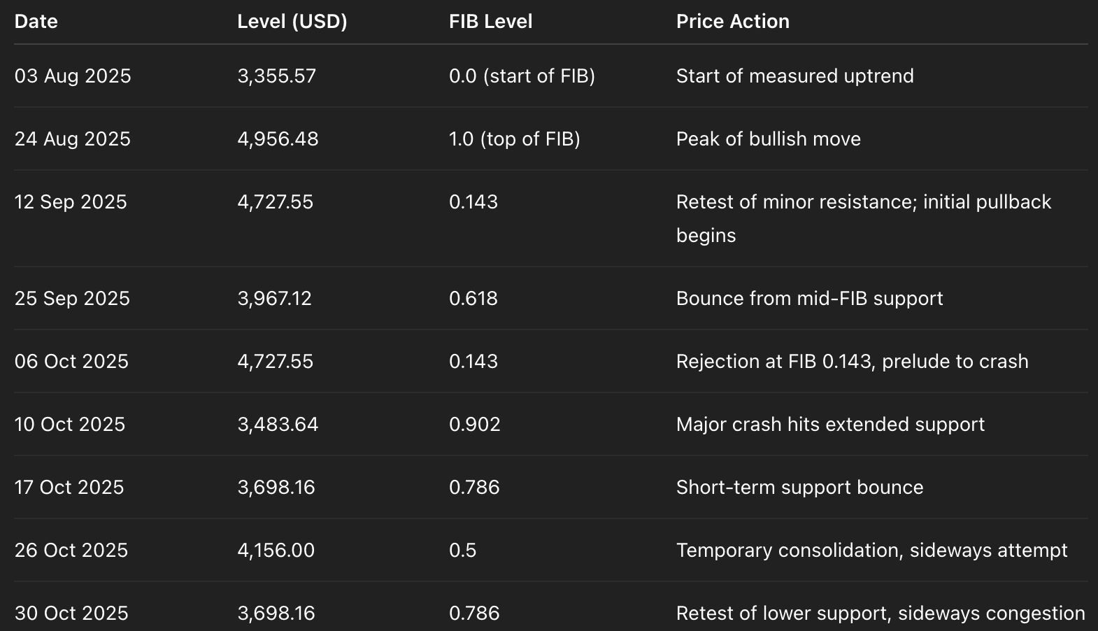 I periodi laterali appaiono a livelli medi di FIB (0.414–0.618), rappresentando accumulazione/distribuzione prima del prossimo grande movimento.