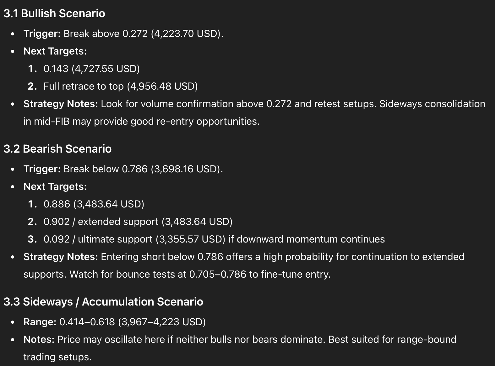 Scenario rialzista richiede una chiara rottura sopra 0.272; cerca ritest per confermare.Scenario ribassista si attiva se 0.786 rompe, con i prossimi livelli chiave a 0.886–0.902.
