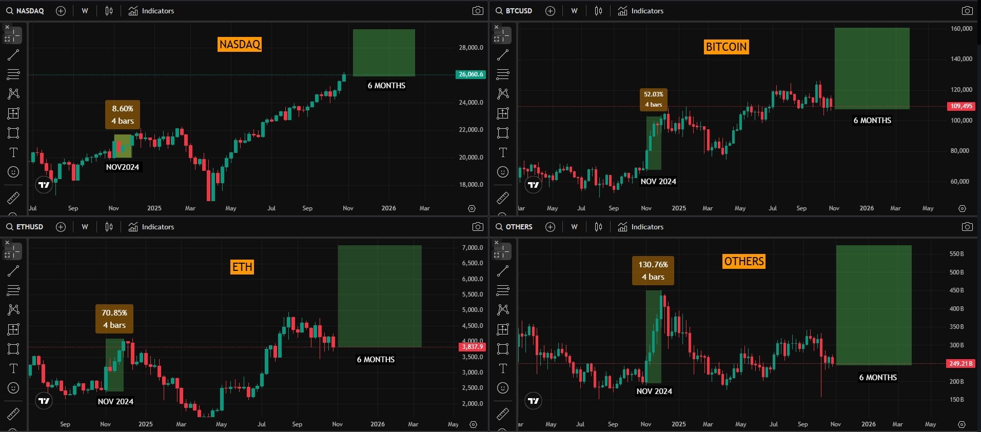 Guarda novembre 2024. Il NASDAQ è salito dell'8,6%. Il Bitcoin è aumentato del 52%. L'Ethereum è aumentato del 70%. Gli altcoin sono esplosi del 130%. Questi non erano eventi separati: erano capitoli nella stessa storia, scritti in lingue diverse ma seguendo la stessa trama.