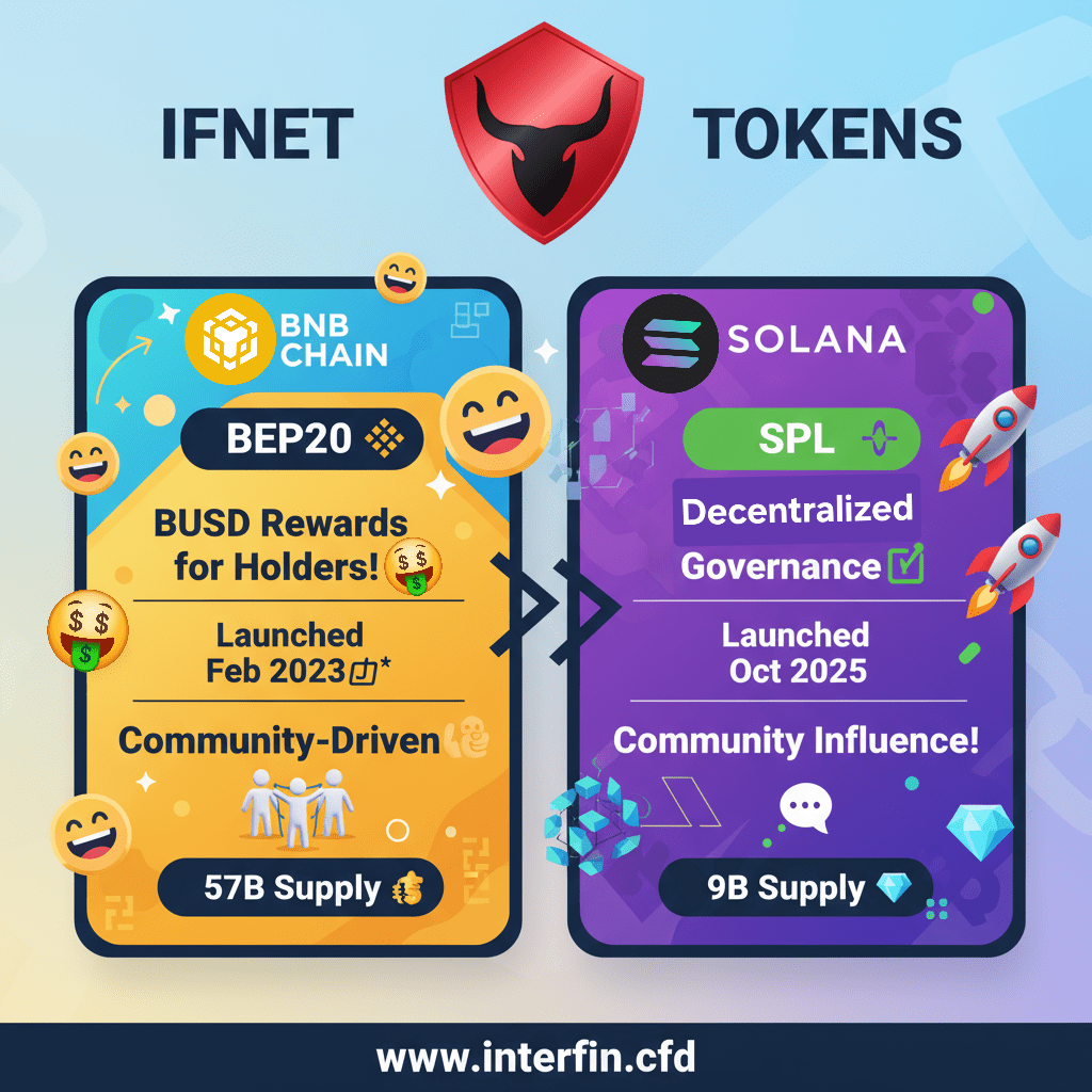 IntroduzioneInterfin.cfd è un progetto DeFi all'avanguardia guidato dalla comunità, progettato per dare potere agli utenti a livello globale con tecnologia blockchain trasparente, sicura ed in evoluzione. La spina dorsale del progetto consiste nel token IFNET, lanciato su BNB Chain (standard BEP20) e Solana (standard SPL), ciascuno con caratteristiche uniche per soddisfare gli appassionati di finanza decentralizzata.