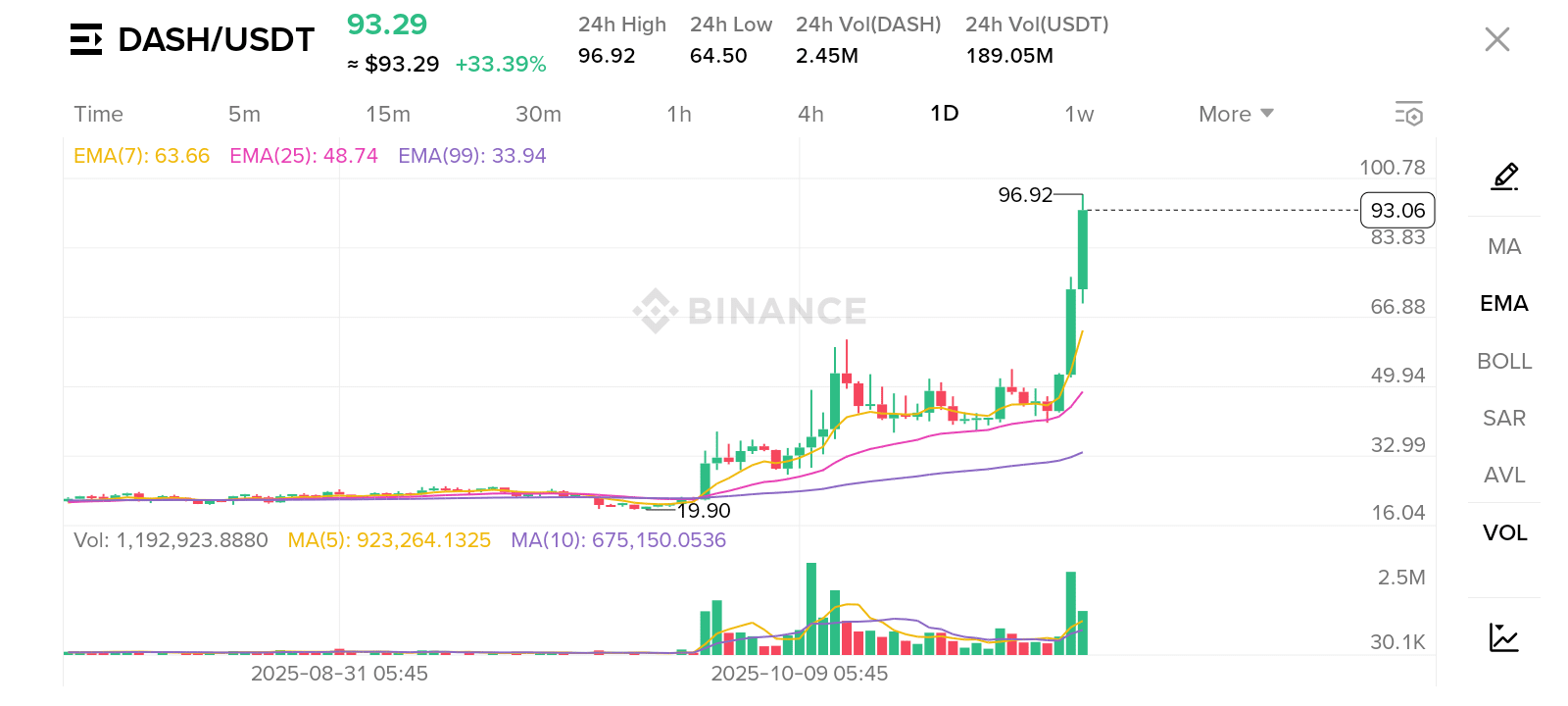 Il grafico va dal 31 agosto 2025 alla data attuale (presumibilmente pochi giorni dopo il 9 ottobre 2025) e mostra l'azione del prezzo per la coppia DASH/USDT.