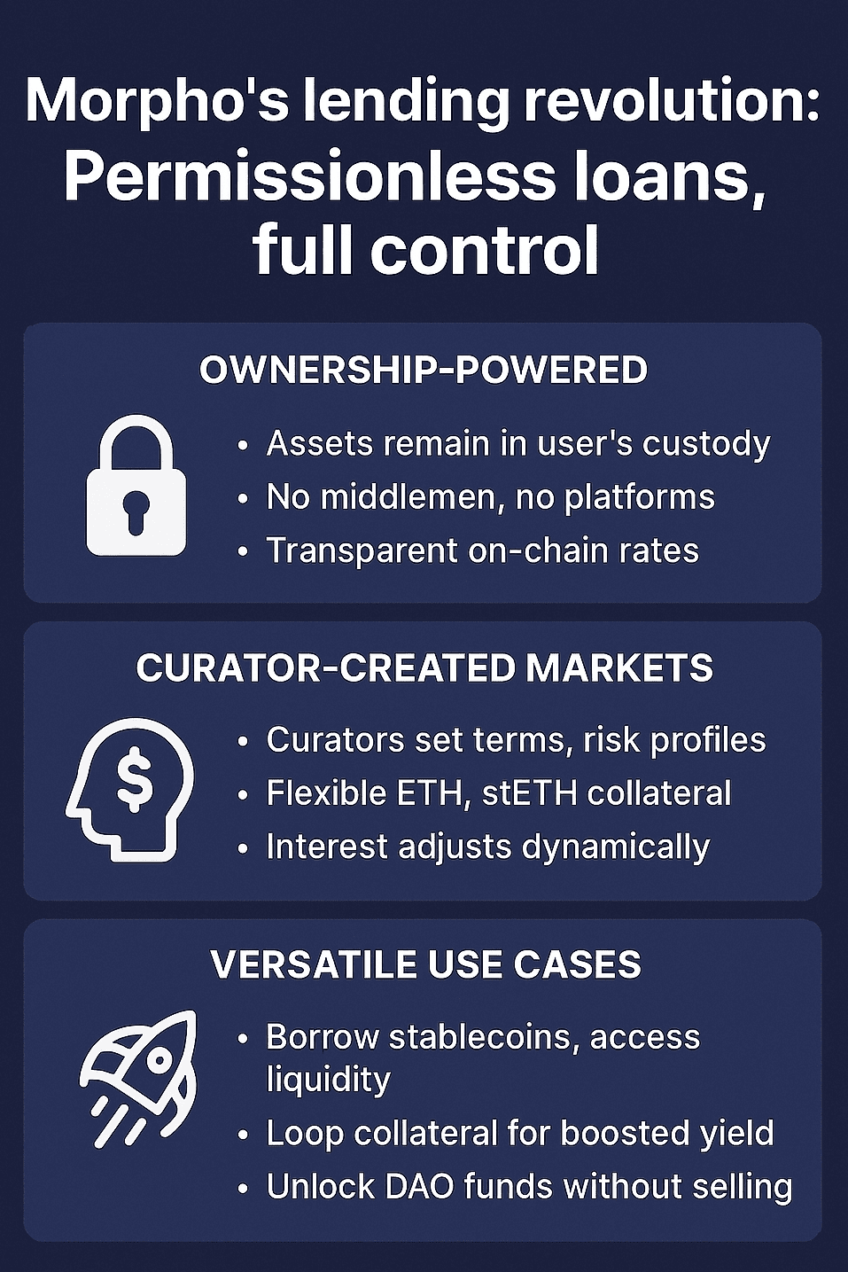 - Nessun custode centralizzato: Il prestito è orchestrato da curatori o logica peer-to-peer.