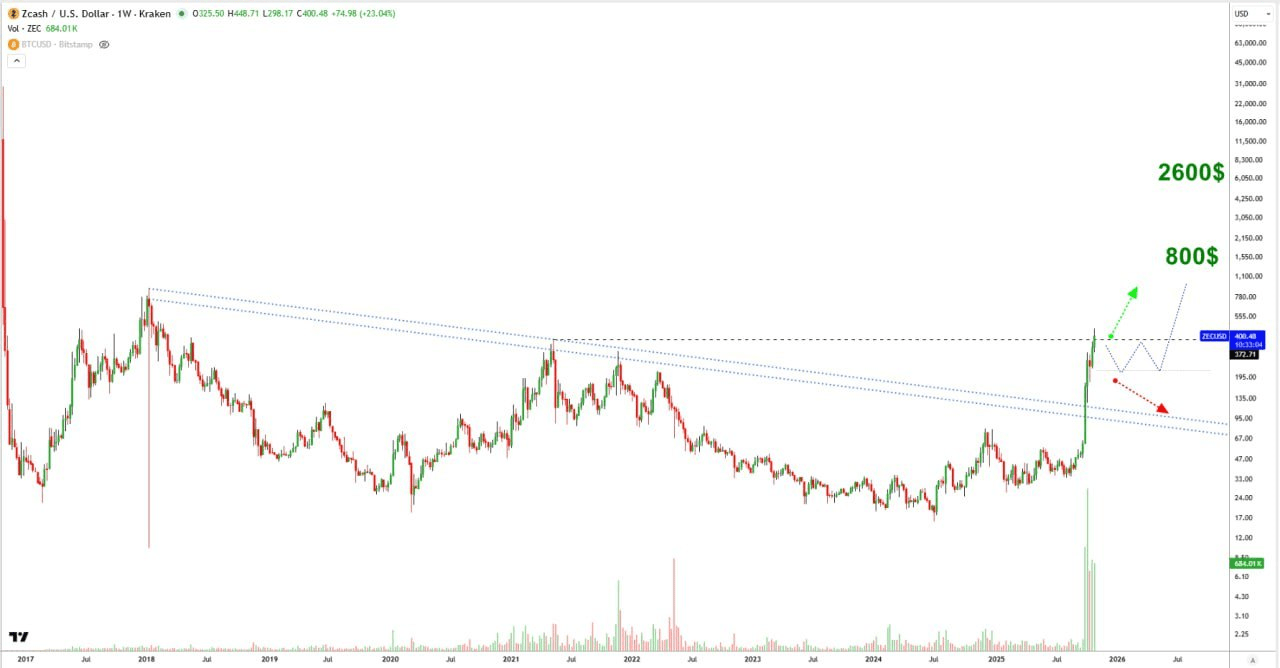 Una rottura sopra $800 significherebbe che ZEC ha superato sia i picchi del 2017 che del 2021 — entrando in un territorio rialzista inesplorato.