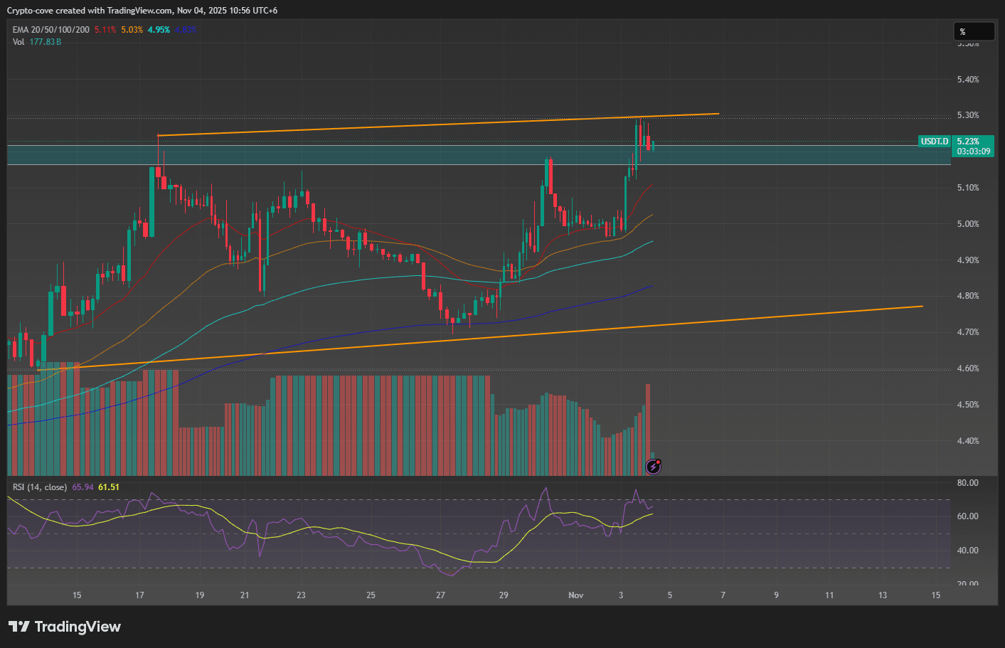 se non sei nuovo in questo mercato, sai che USDT.D ha una correlazione negativa con il mercato delle criptovalute. Possiamo vedere che USDT.D è vicino al suo livello di resistenza e sta mostrando segnali rialzisti. Potrebbe aumentare ulteriormente del 20%. Con questa analisi possiamo anche dire che xrp è ribassista