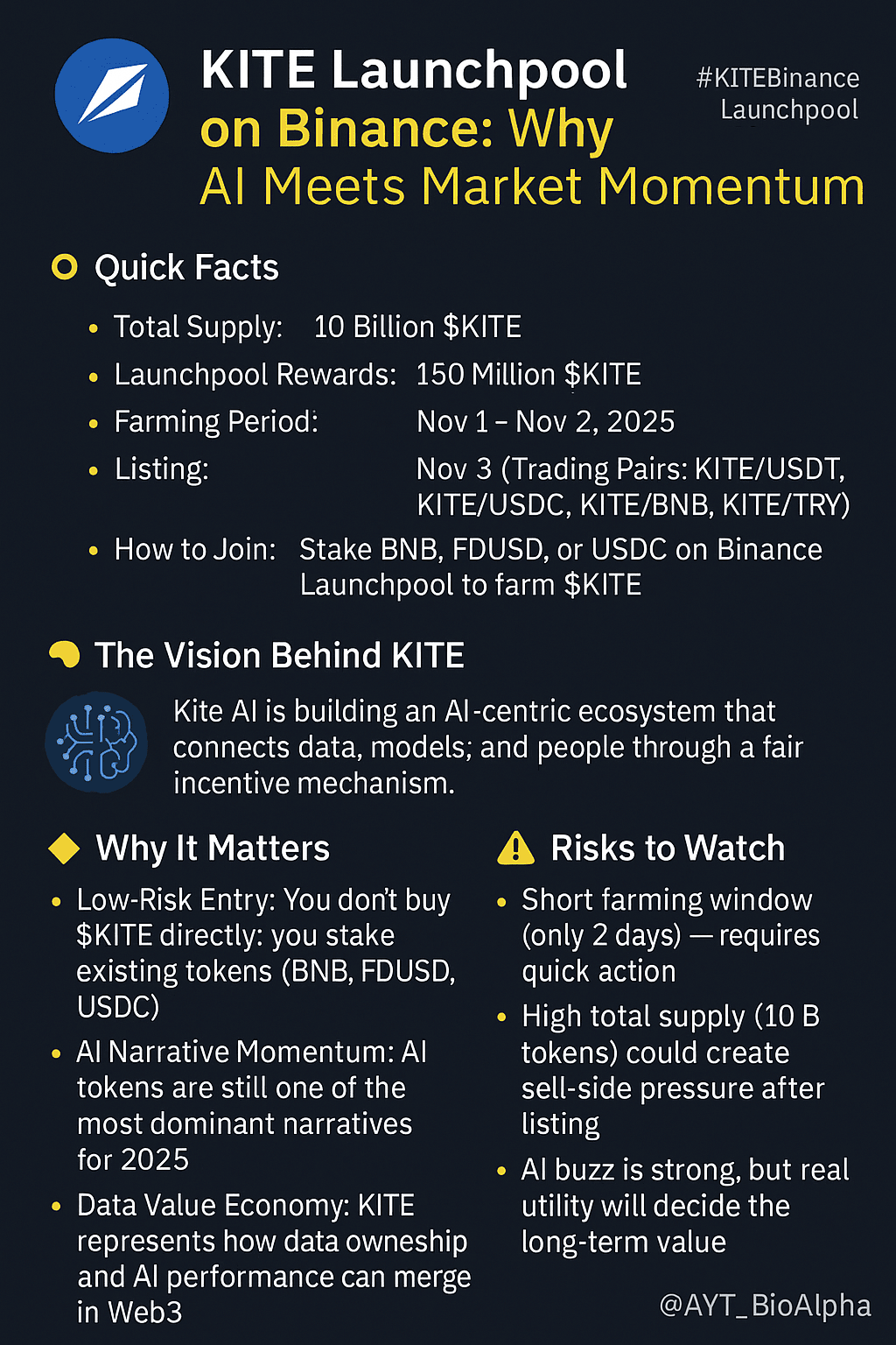 Kite AI ($KITE) è il 71° progetto di Launchpool di Binance, che unisce intelligenza artificiale, scienza dei dati e un'economia di token guidata dal mercato.