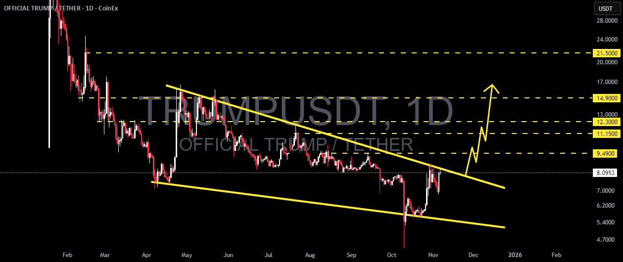 Dopo un prolungato ribasso da metà anno, TRUMP/USDT sta ora mostrando una delle formazioni tecniche più entusiasmanti: un Cuneo Discendente, che si stringe gradualmente — un modello classico che spesso precede un'importante inversione rialzista.