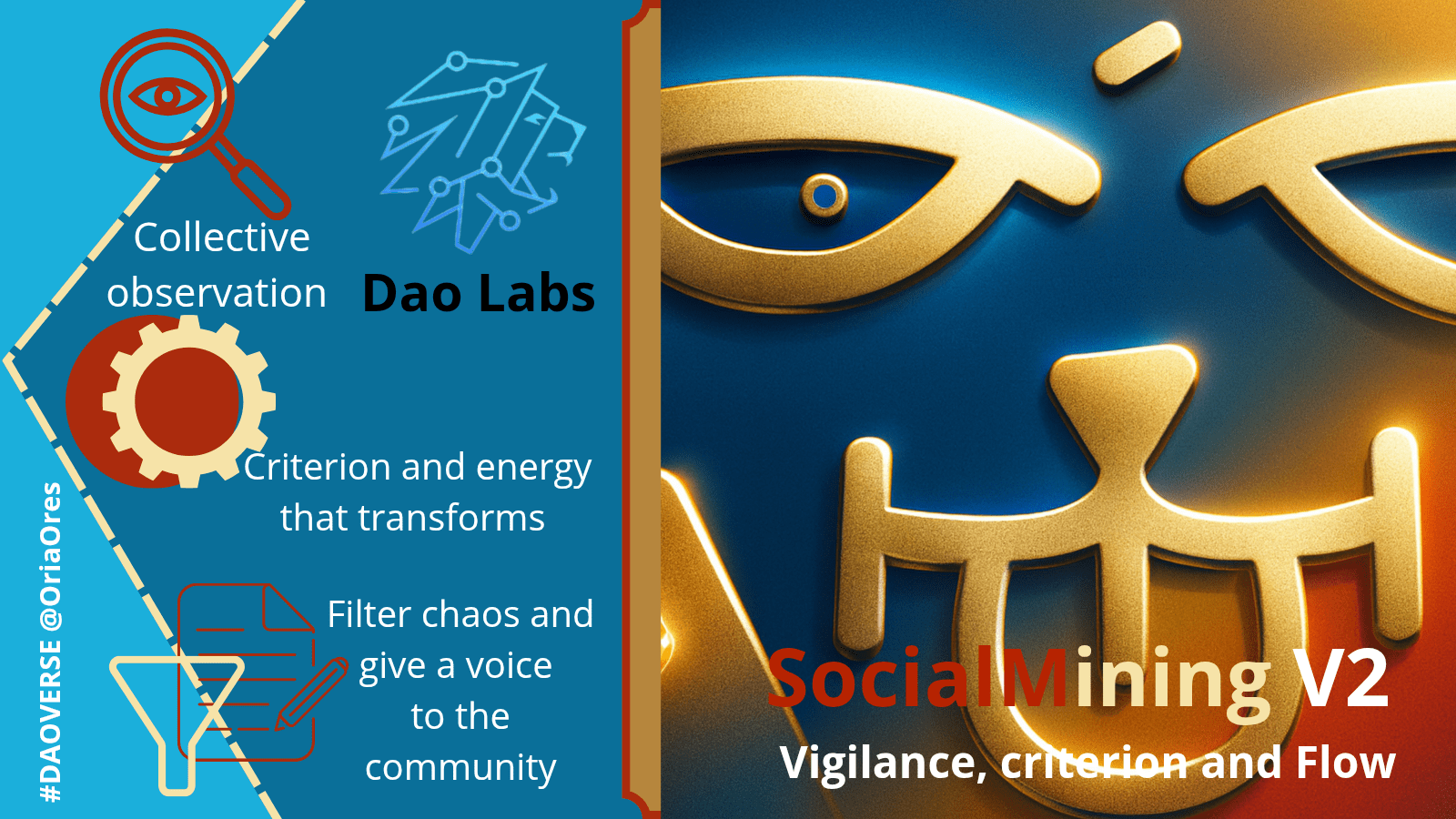 Gli occhi suggeriscono vigilanza comunitaria, un sistema che non si limita a registrare, ma valuta. La bocca rigida e filtrata implica discernimento. Social Mining V2 non sarà uno spazio per il rumore, ma per l'intenzione. Ogni azione conterà, ma non tutte passeranno.