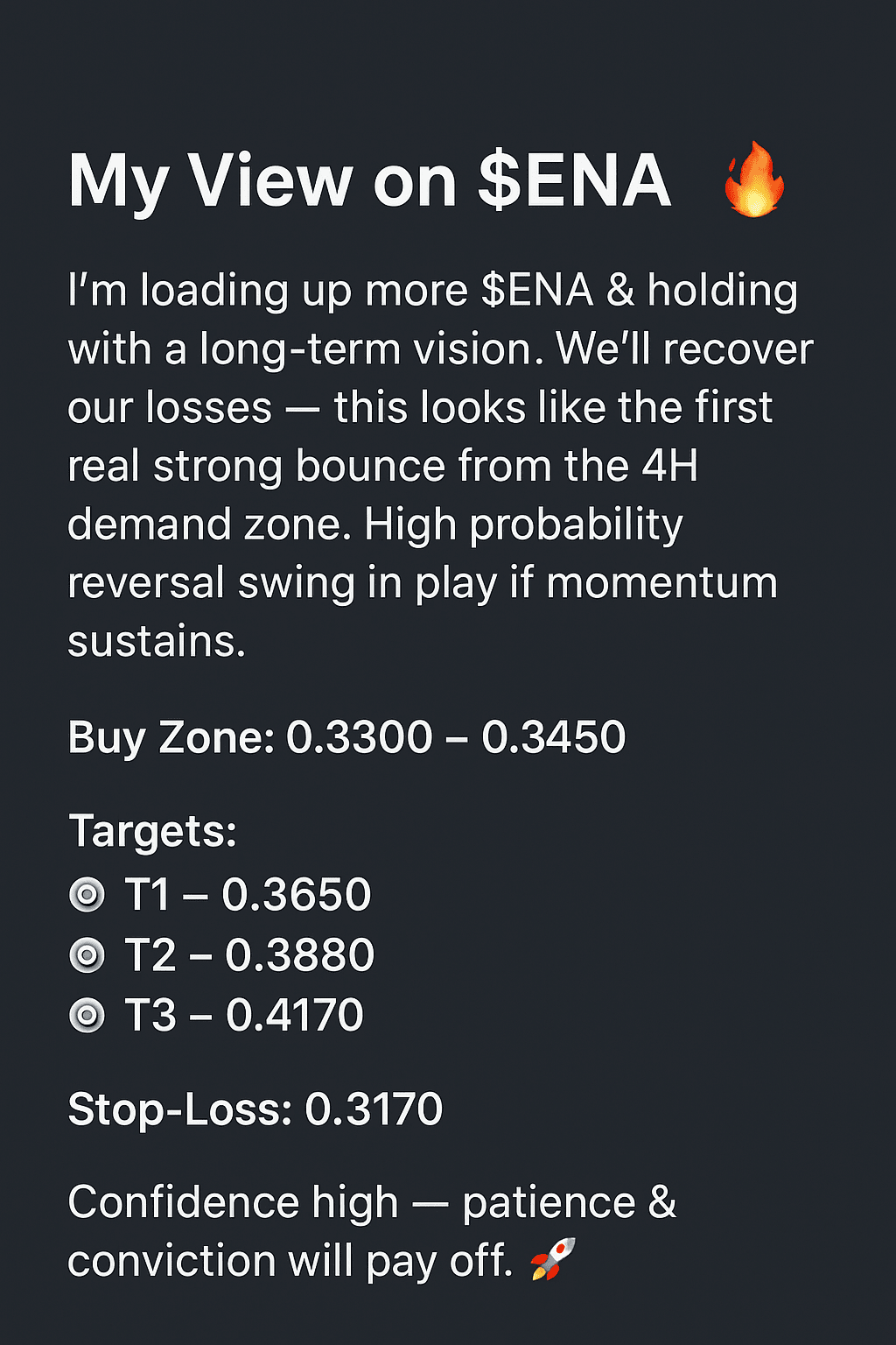 Sto caricando di più $ENA & tenendo con una visione a lungo termine. Recupereremo le nostre perdite — questo sembra il primo vero forte rimbalzo dalla zona di domanda 4H. Alta probabilità di inversione in gioco se il momentum si mantiene.