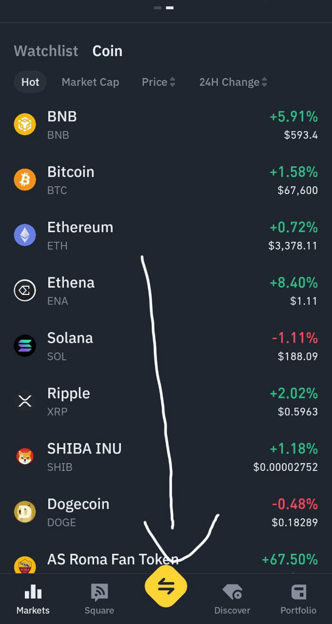 Per accedere all'opzione di conversione di Binance sull'app Binance lite, tocca semplicemente questo simbolo di scambio come mostrato nell'immagine qui sotto.