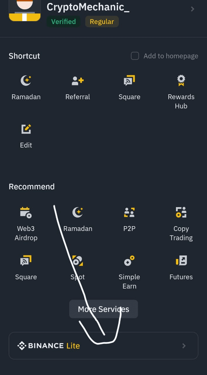 poi semplicemente tocca su Binance light in fondo alla tua app e ti porterà all'interfaccia di "Binance lite".